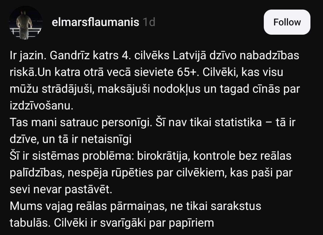 “Gandrīz katrs ceturtais cilvēks Latvijā dzīvo nabadzības riskā. Katra otrā vecā sieviete virs 65 gadiem cīnās par izdzīvošanu. Cilvēki, kas visu mūžu strādājuši, maksājuši nodokļus, tagad mēģina izdzīvot. Tā nav tikai statistika, tā ir dzīve,” viņš uzsver.