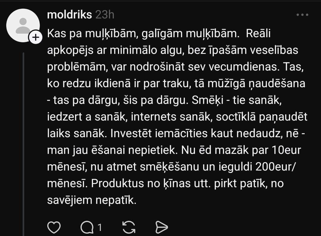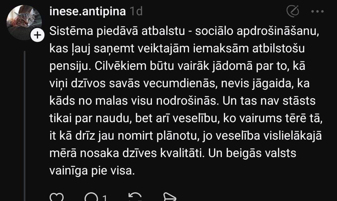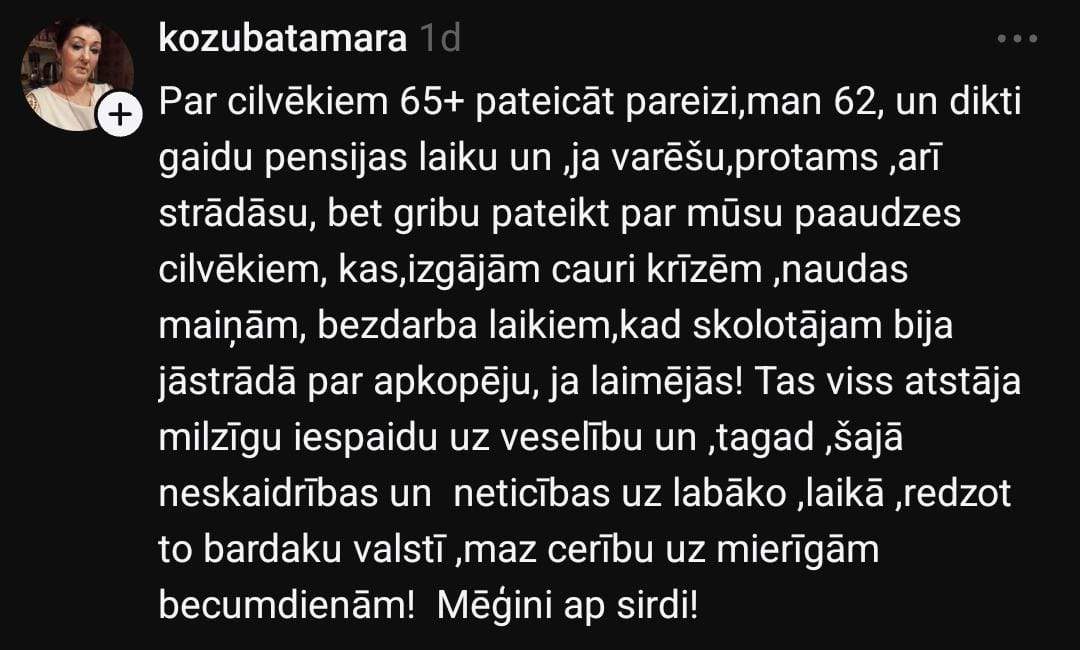 Arī Olga stāsta: “Manai vecmāmiņai ir 88 gadi un 2. invaliditātes grupa. Viņas pensija ar piemaksām ir ap 500 eiro. Kaimiņam, kurš visu mūžu strādājis autoservisā, arī 500 eiro. Tikmēr daudzi frizieri, tetovētāji, online pārdevēji nemaksā nodokļus – un pensijas viņiem? Cik?”