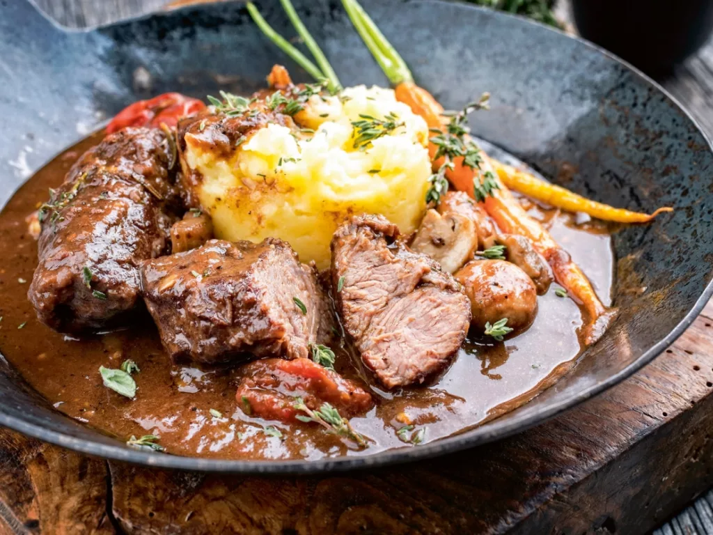 Šī sātīgā ēdiena recepte nāk no Dānijas. Ēdienu pasniedz ar maizi, lai ar to var izslaucīt mērci no šķīvja.