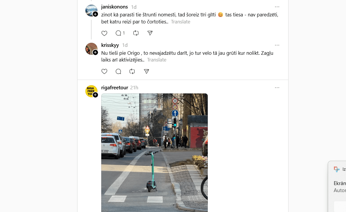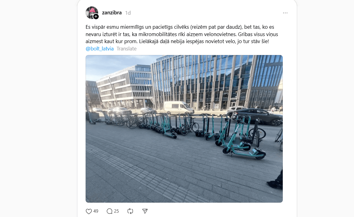 Lai gan mikromobilitāte tiek sludināta kā mūsdienīgs un zaļš pārvietošanās veids, realitāte uz ietvēm bieži ir tracinoša. Kamēr dažviet vērojama relatīva kārtība un skrejriteņi glīti sarindoti tam paredzētās zonās, citviet, it īpaši šaurajās vēsturiskā centra ieliņās, tie kļūst par īstu šķēršļu joslu.
