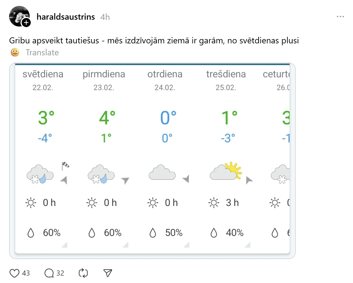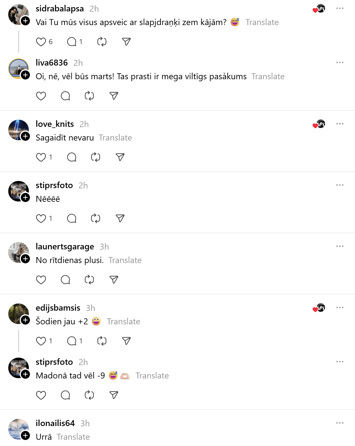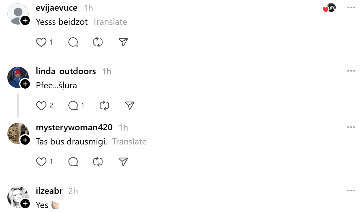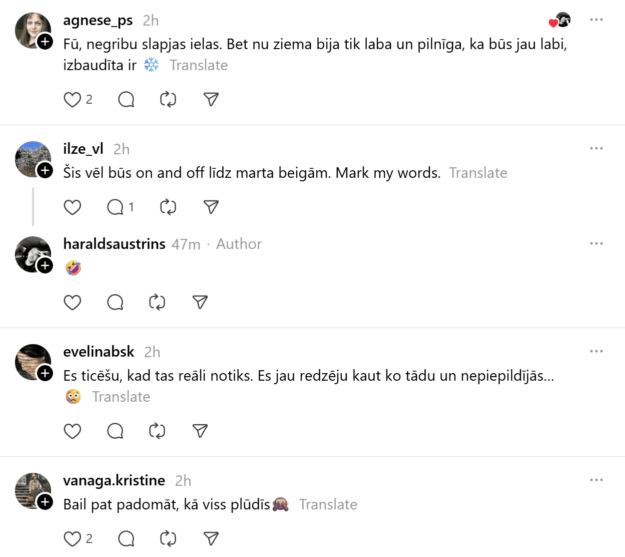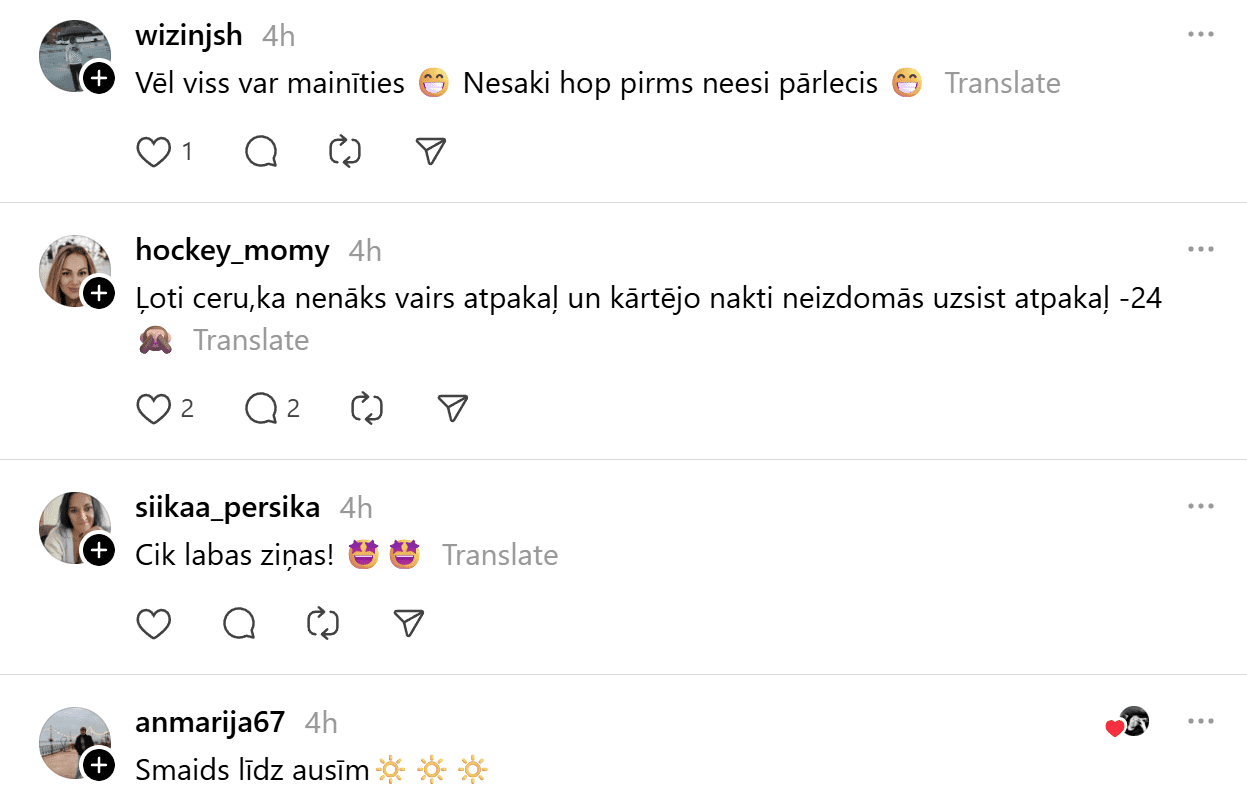 Sociālajā tīklā “Threads” cilvēki gan ar sajūsmu reaģējuši uz ziņu, ka Latvijā pakāpeniski ieplūdīs siltāka gaisa masa, gan arī ar sava veida nepatiku, bet tikai tāpēc, ka tas nozīmēs slapjdraņķi un “šļuru” zem kājām.