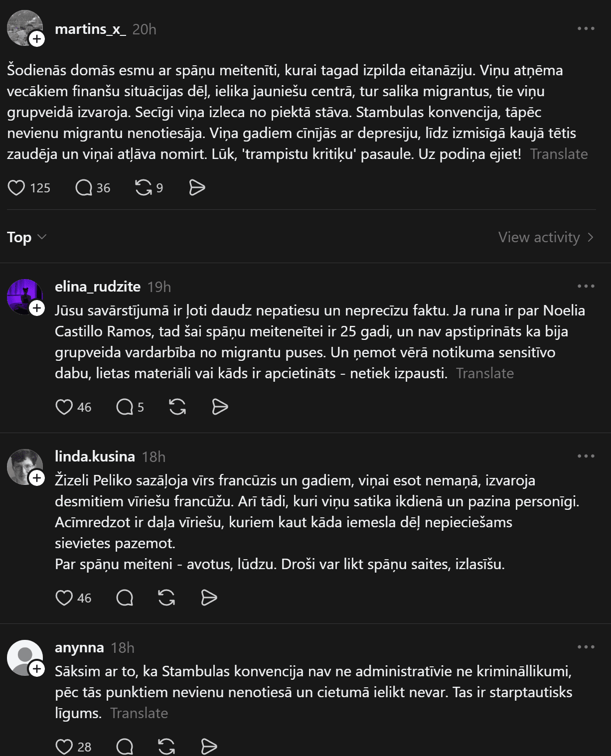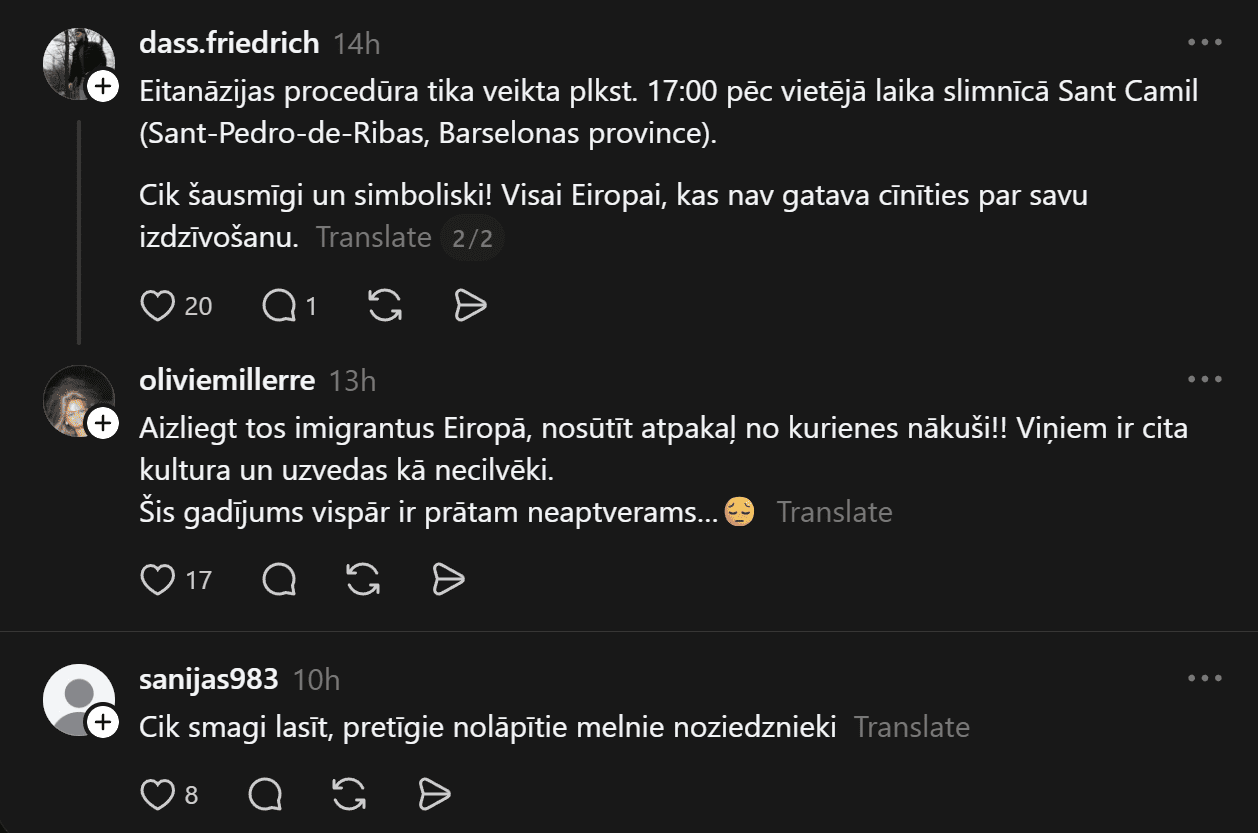 Vakar mūžībā devās spāniete Noelija Kastiljo Ramosa, kuru grupveidā izvaroja migranti no Ziemeļāfrikas. Viņa pēc tam centās izdarīt pašnāvību, izlecot no 5. stāva, bet izdzīvoja. Kritiena rezultātā viņa tika paralizēta no jostasvietas uz leju, un visu atlikušo mūžu cīnījās ar hroniskām sāpēm un depresiju, vēsta ārzemju mediji.