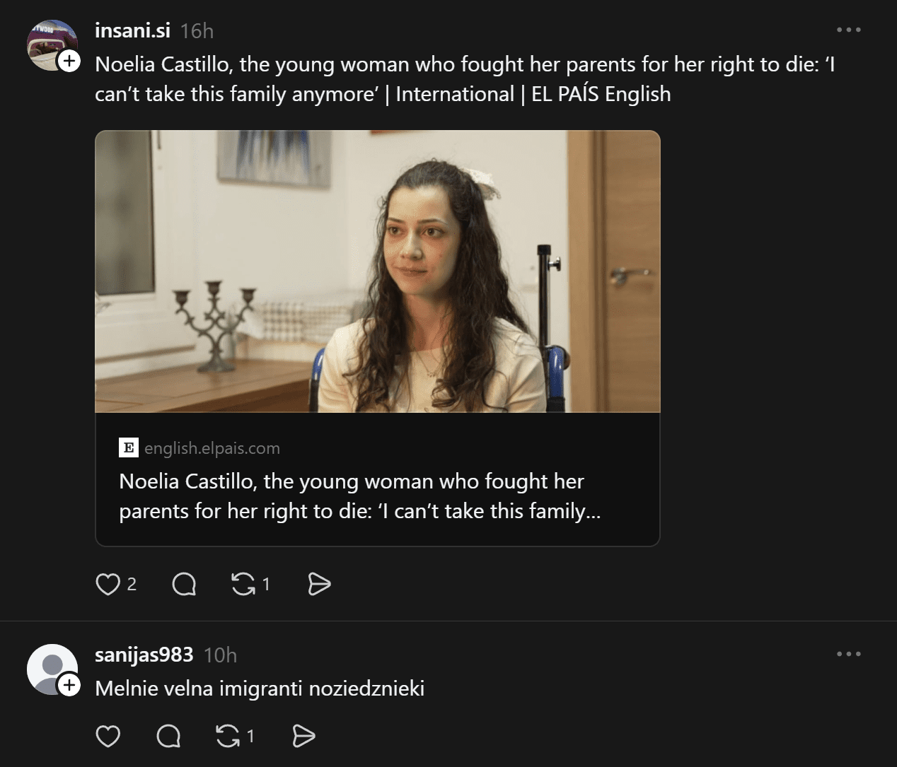 Noelija, kura dzīvoja Barselonā, ceturtdienas vakarā mira aprūpes iestādē, kur viņai tika veikta eitanāzija. Līdz pat pēdējam brīdim viņa paralēli tiesājās sarežģītā tiesvedībā ar savu tēvu, kurš centās apturēt šo procesu. Tomēr gan Spānijas tiesas, gan Eiropas Cilvēktiesību tiesa nostājās viņas pusē.