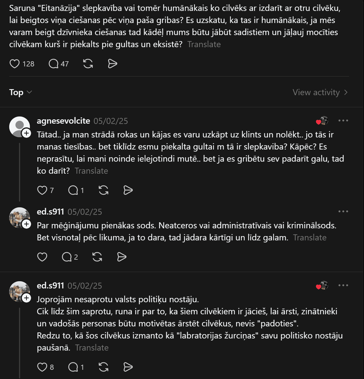 Spānijā eitanāzija tika legalizēta 2021. gadā cilvēkiem ar neārstējamām vai smagi invalidizējošām slimībām. Lai saņemtu atļauju, pacientiem jāiziet stingra procedūra – jāiesniedz vairāki rakstiski pieprasījumi un jāsaņem neatkarīgu mediķu un ekspertu komisijas apstiprinājums.