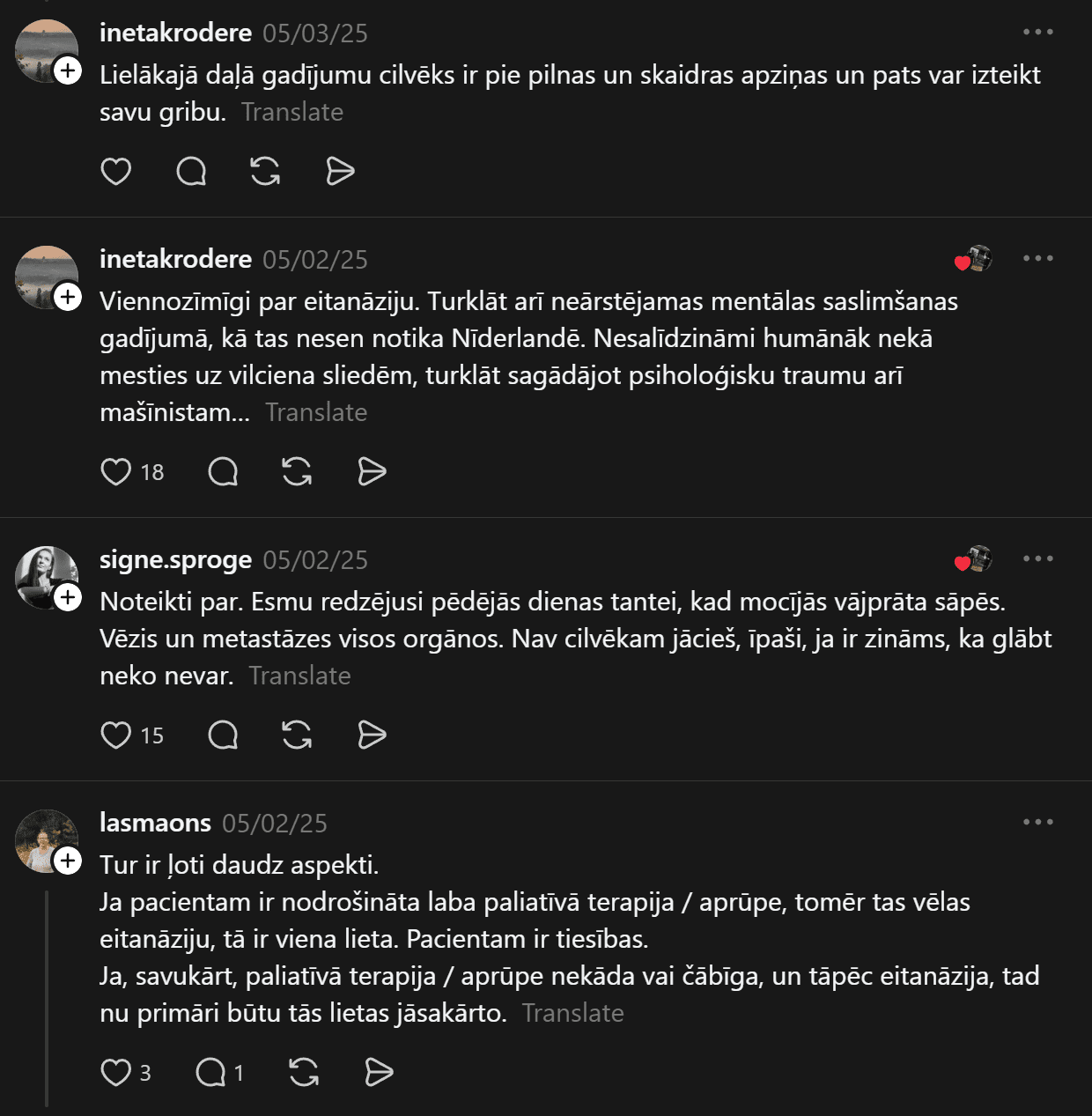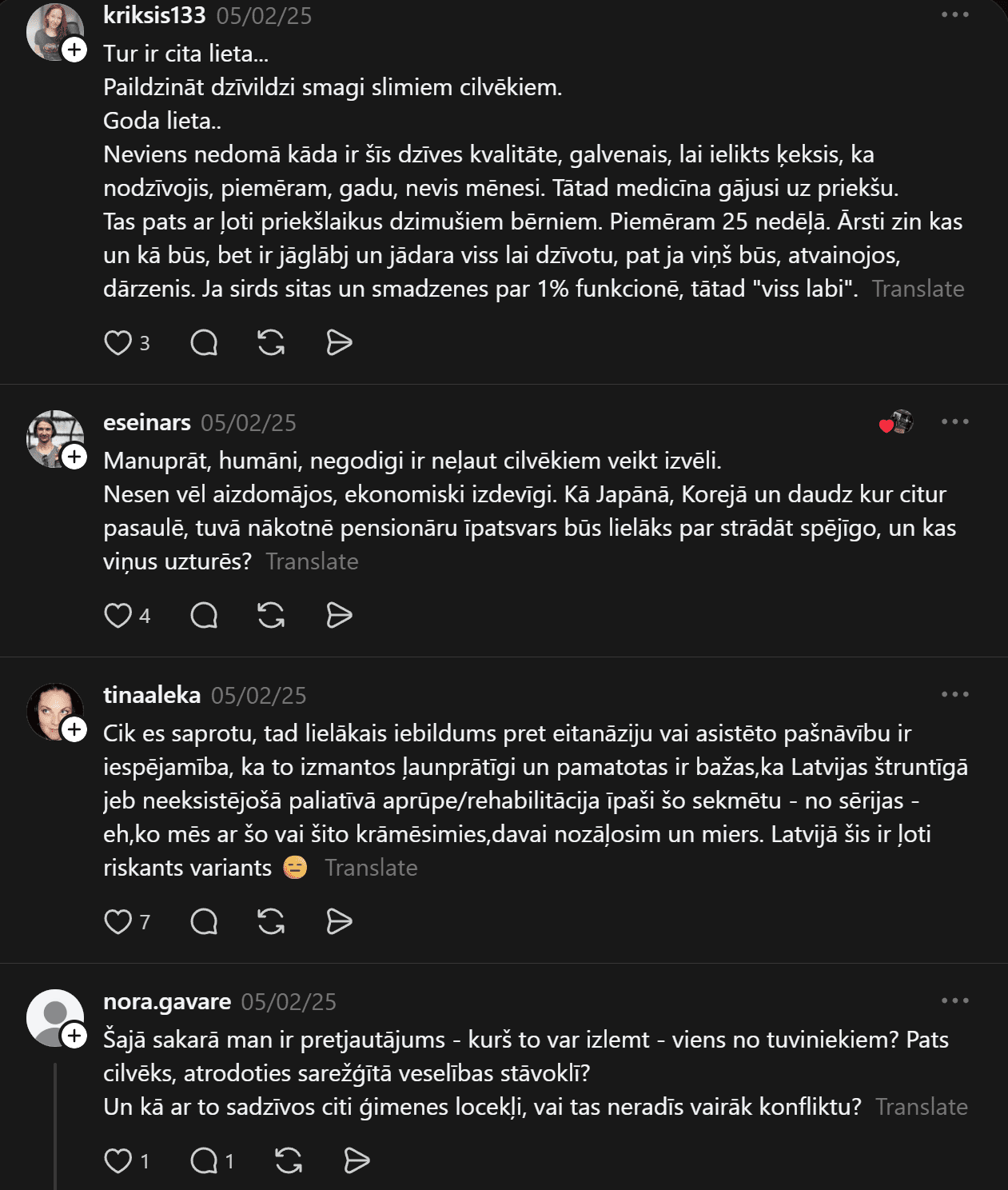 Viņa uzsvēra, ka jau no paša sākuma bijusi pārliecināta par savu izvēli, lai gan ģimene to neatbalstīja. “Neviens no maniem tuviniekiem nav par eitanāziju. Bet ko darīt ar visām sāpēm, ko esmu piedzīvojusi?” viņa jautāja. “Laime tēvam, mātei vai māsai nevar būt svarīgāka par meitas dzīvi.”