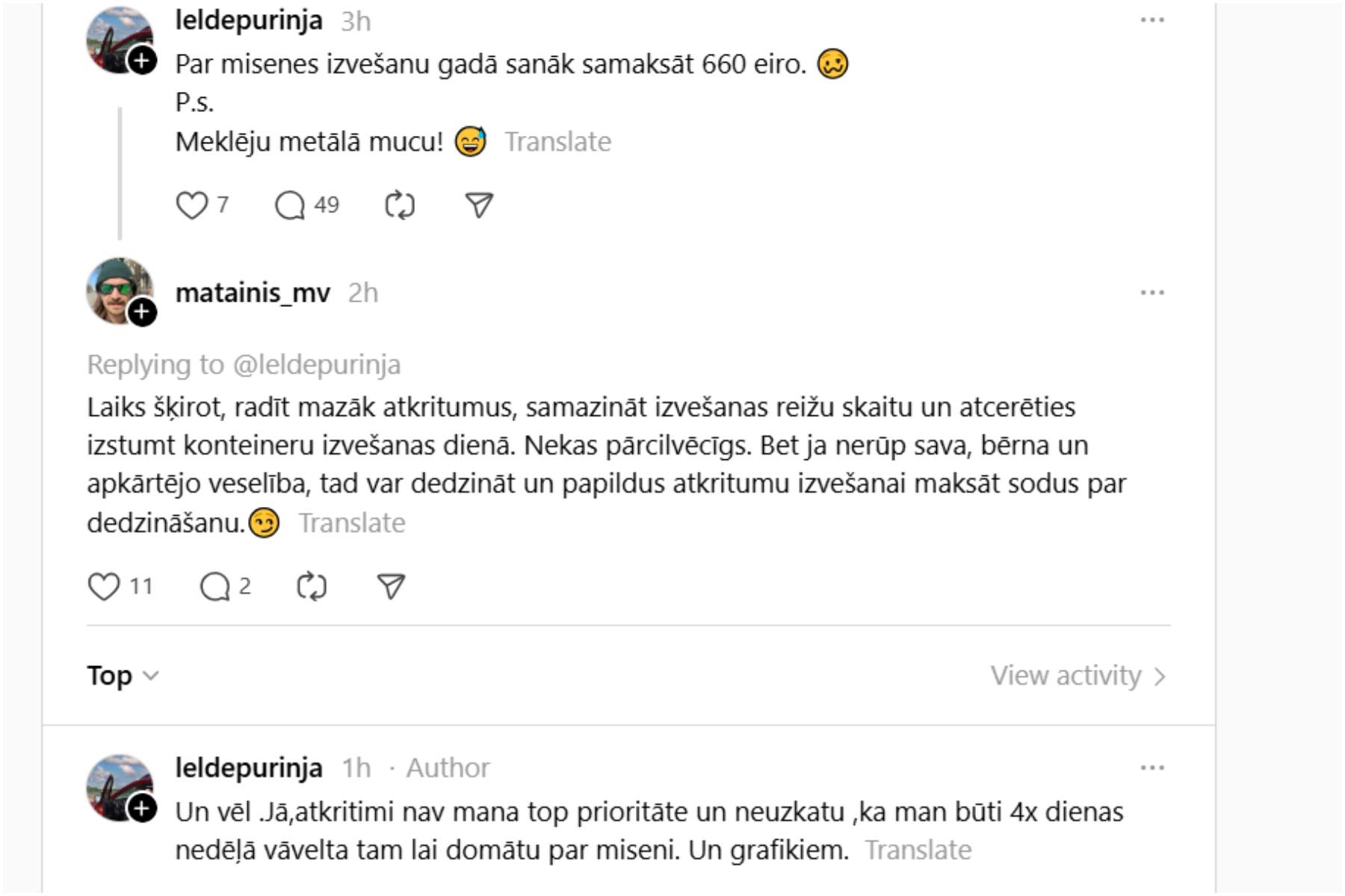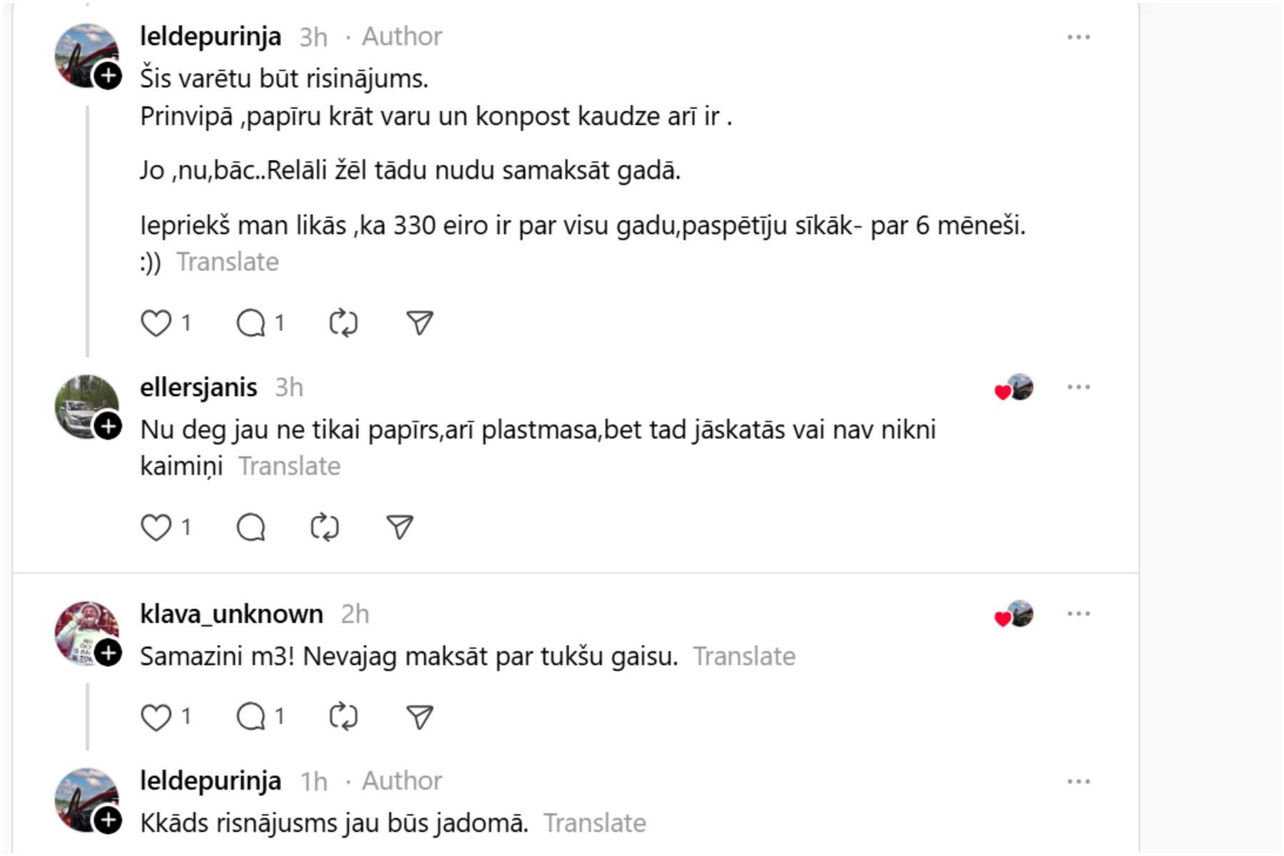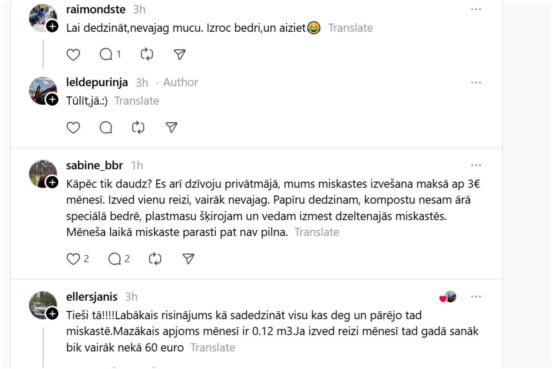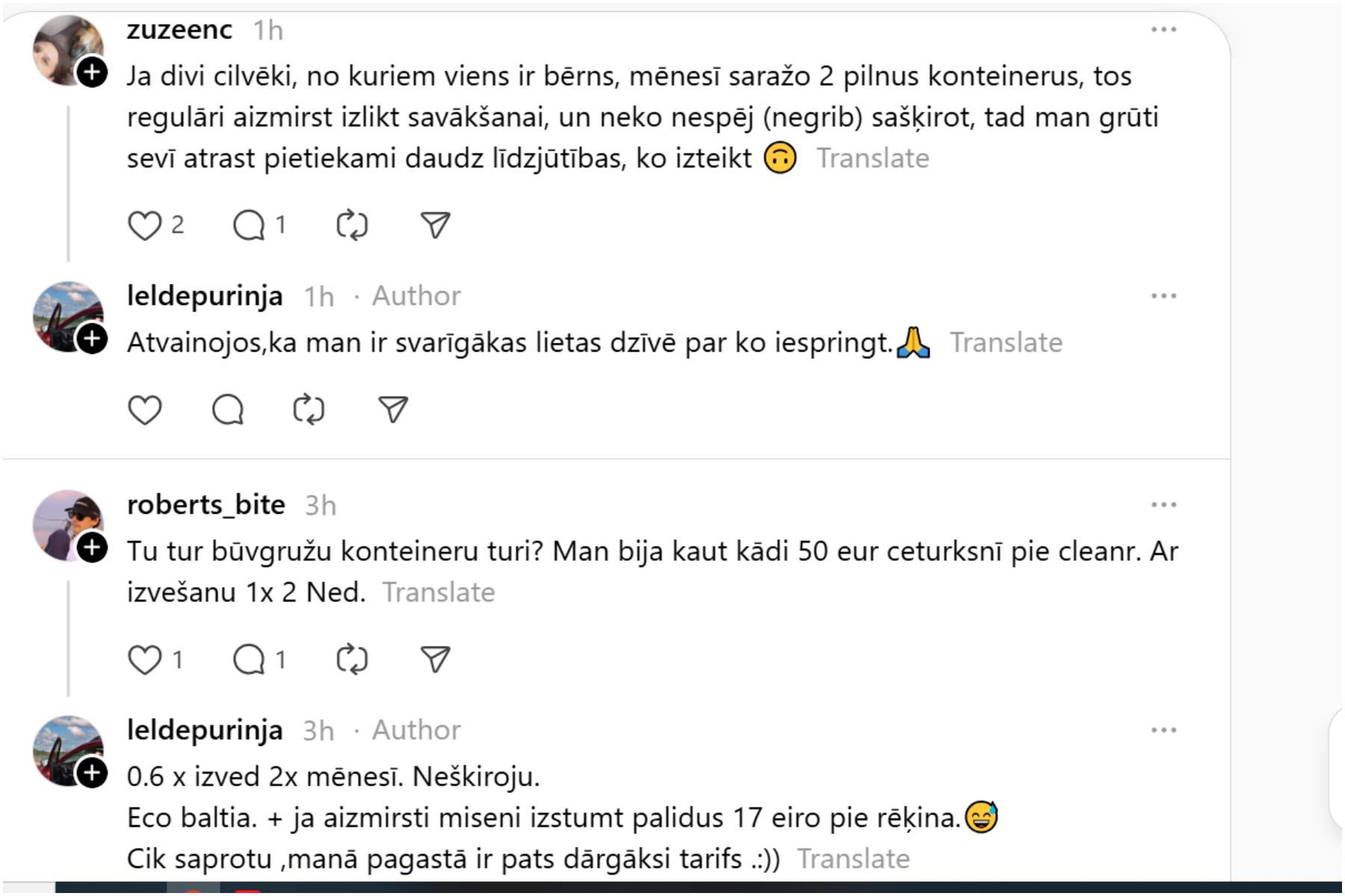 Tas viss būtu tā kā saprotams, taču iedzīvotājiem šīs izmaksas galu galā, rēķinot gada griezumā, daudzviet lieka matiem celties stāvus. Par to arī izvērtusies diskusija vietnē Threads, savācot virkni komentāru, kur sanākušie dalās arī ar padomiem, kā šos ŗēkinus samazināt. Populārākais no ieteikumiem – sākt šķirot atkritumus! Lūk, komentāru izlase.
