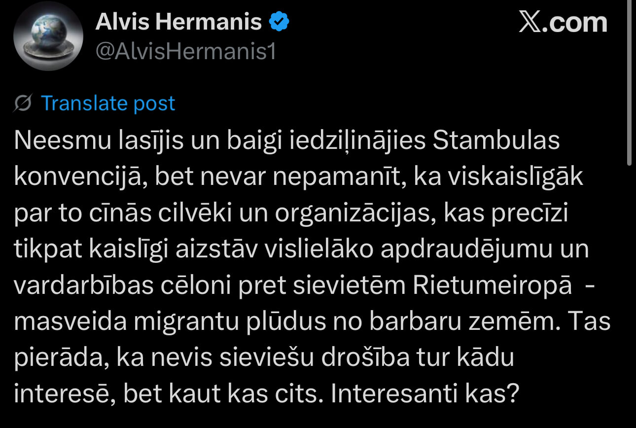 Hermanis vaicā: “Neesmu lasījis un baigi iedziļinājies Stambulas konvencijā, bet nevar nepamanīt, ka viskaislīgāk par to cīnās cilvēki un organizācijas, kas precīzi tikpat kaislīgi aizstāv vislielāko apdraudējumu un vardarbības cēloni pret sievietēm Rietumeiropā – masveida migrantu plūdus no barbaru zemēm. Tas pierāda, ka nevis sieviešu drošība tur kādu interesē, bet kaut kas cits. Interesanti kas?”