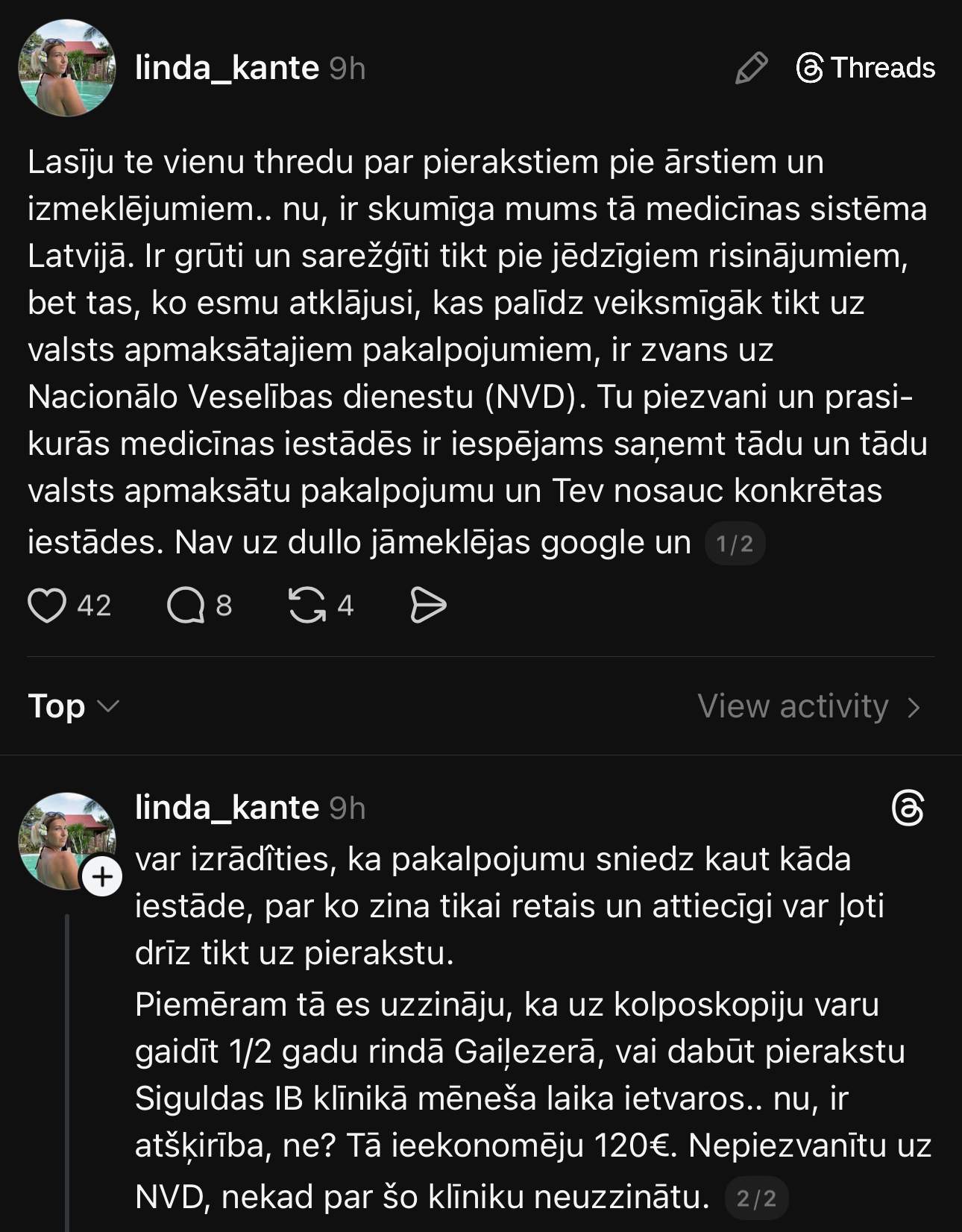 “Lasīju te vienu “Threads” publikāciju par pierakstiem pie ārstiem un izmeklējumiem. Nu, ir skumīga mums tā medicīnas sistēma Latvijā. Ir grūti un sarežģīti tikt pie jēdzīgiem risinājumiem, bet tas, ko esmu atklājusi, kas palīdz veiksmīgāk tikt uz valsts apmaksātajiem pakalpojumiem, ir zvans uz Nacionālo veselības dienestu (NVD). Tu piezvani un prasi, kurās medicīnas iestādēs ir iespējams saņemt tādu un tādu valsts apmaksātu pakalpojumu, un tev nosauc konkrētas iestādes. Nav jāmeklē uz dullo “Google”, un var izrādīties, ka pakalpojumu sniedz kāda iestāde, par kuru zina tikai retais, un attiecīgi var ļoti drīz tikt uz pierakstu.