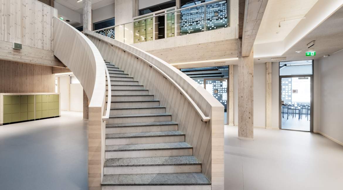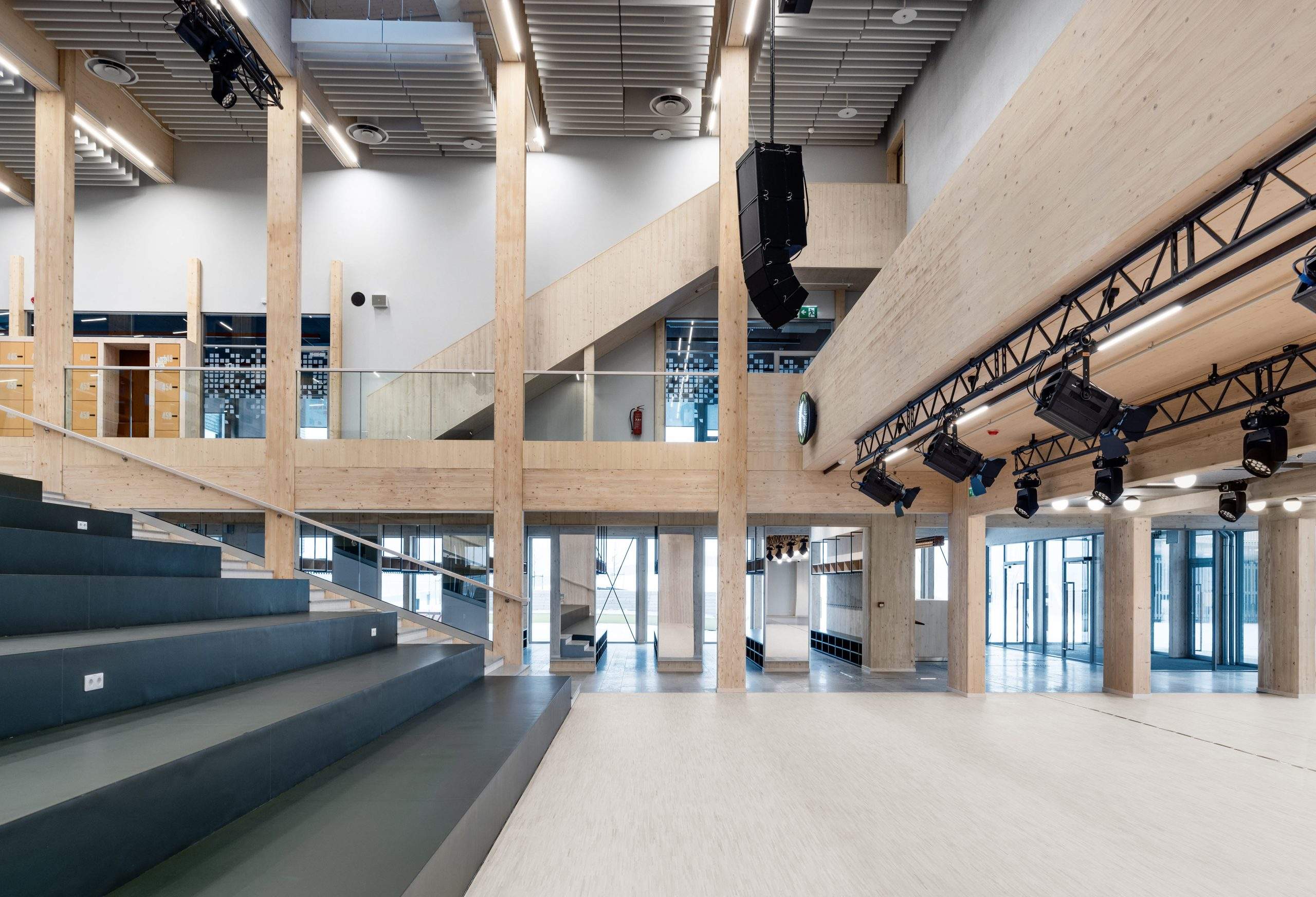 Skolas ēkas sirds ir lielā zāle ar kāpnēm, kur skolēni var pulcēties pasākumiem. Kāpnes ved uz bibliotēku, kas atrodas otrajā stāvā, zem kuras atrodas auditorija, kas saņem dabisko apgaismojumu pa bibliotēkas jumta logiem. Interjera risinājumi ir veidoti no dabīgiem materiāliem, daudz izmantojot vietējo koksni un kaļķakmeni. Kopējais telpu iespaids ir gaišs, plašs un rotaļīgs. Logi klašu telpu iekšsienās paver skatu cauri ēkai, apvienojot ārtelpu ar iekštelpām.