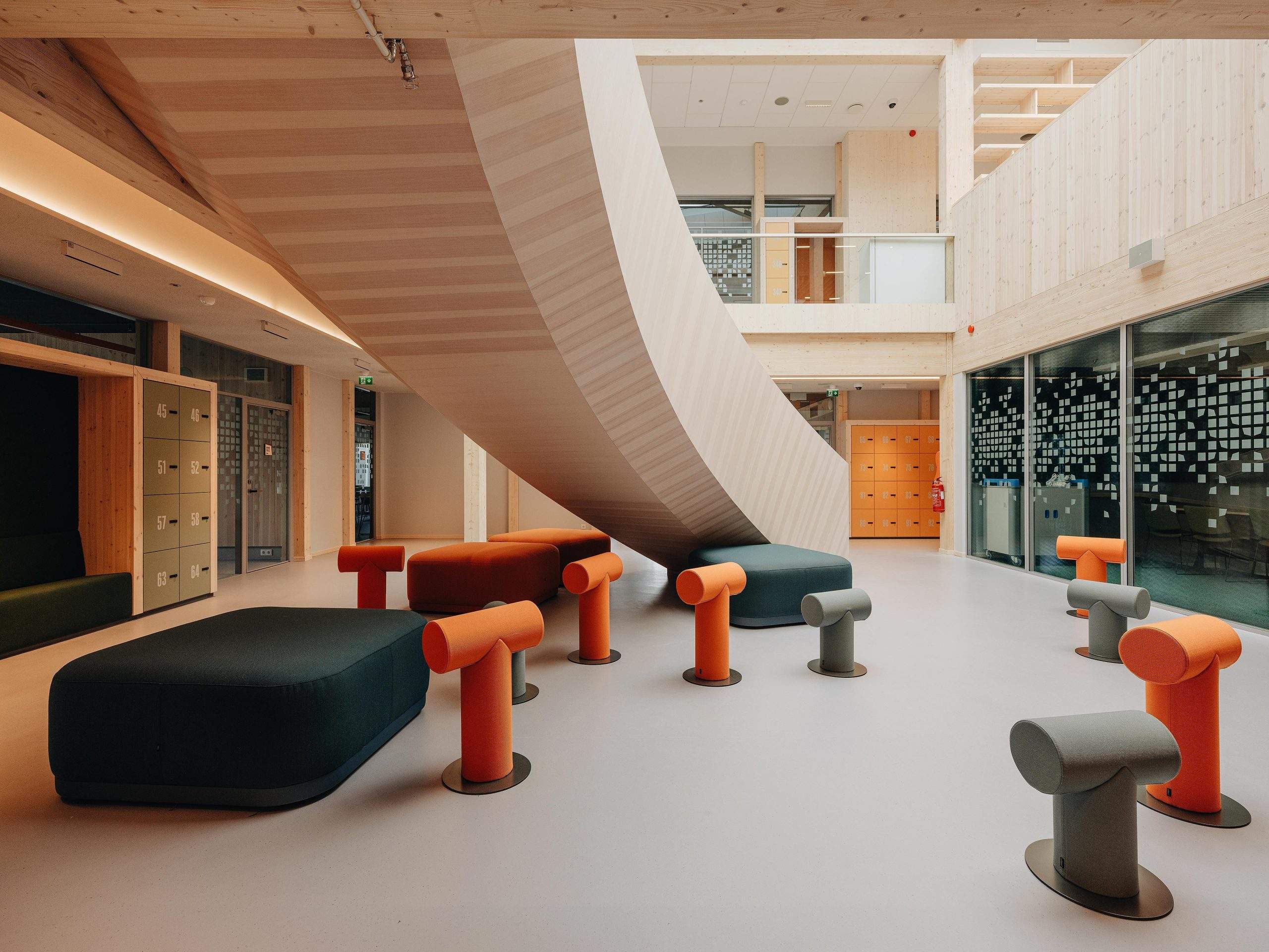 Gan skolas ēkas, gan sporta bāzes interjera arhitektūra atbilst ilgtspējīgas vides dizaina principiem. Interjera arhitekti ir izvēlējušies materiālus ar mazāku ietekmi uz vidi, ņemot vērā materiālu atkārtotas izmantošanas priekšrocības, zemu ražošanas enerģijas patēriņu un vietējo izcelsmi, lai samazinātu ar transportu saistīto enerģijas patēriņu. Uzmanība ir pievērsta arī toksisku, gaistošu vai citādi kaitīgu vielu izmantošanas novēršanai. Rūpīgi pārdomāto materiālu izvēli papildina mūžīga dizaina idioma, kas paredzēta kalpošanai gadu desmitiem.