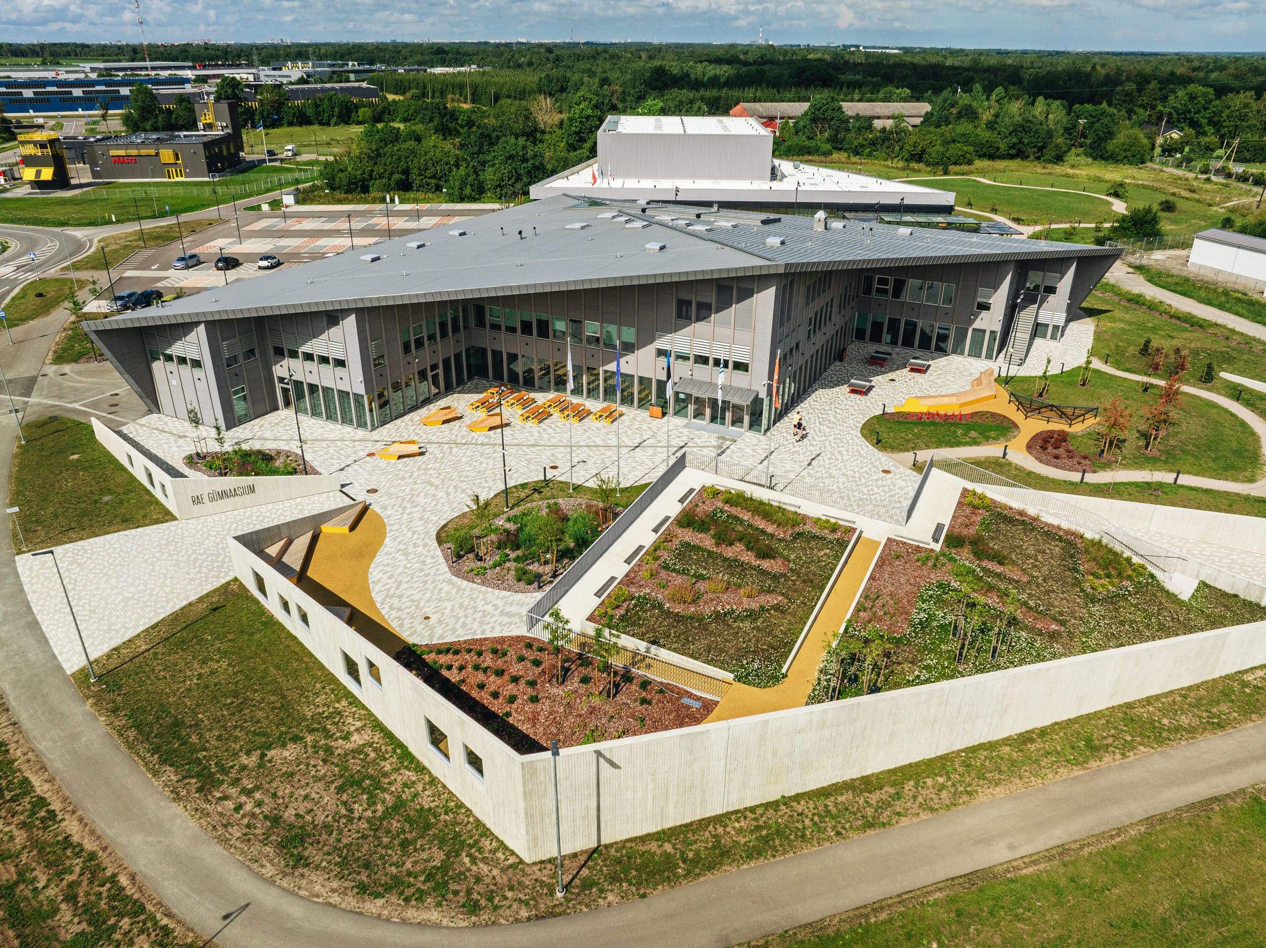 Ģimnāzijas ēka ar pagalmu ir vērsta uz dienvidiem pret Arukila (Arukül) ceļu. Arhitektoniskais akcents ir ēkas jumta apvienojums ar plašo nojumi, kas atgādina papīra lidmašīnas siluetu un praktiski aizsargā telpas no tiešiem saules stariem. Skolas pagalmu no ceļa atdala mainīga augstuma betona trokšņu sienu zaļās nogāzes. Sporta ēka atrodas teritorijas ziemeļu pusē. Visas ēkas veido integrētu veselumu, ko ieskauj kopīga parka zona ar dažādām aktivitātēm vecākiem un jaunākiem bērniem, kā arī vietējiem iedzīvotājiem. Galvenās koplietošanas telpas – lielā zāle, ēdnīca, galvenā ieeja un ģērbtuve – atrodas pirmajā stāvā, bet klases telpas un bibliotēka – otrajā stāvā. Sporta ēka ir projektēta kā vienstāva apjoms. Augstākās telpas bumbas spēlēšanai atrodas ēkas ziemeļu pusē, bet ģērbtuves un citas sporta zāles izvietotas uz pagalma pusi dienvidos.