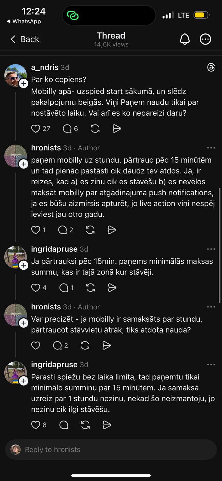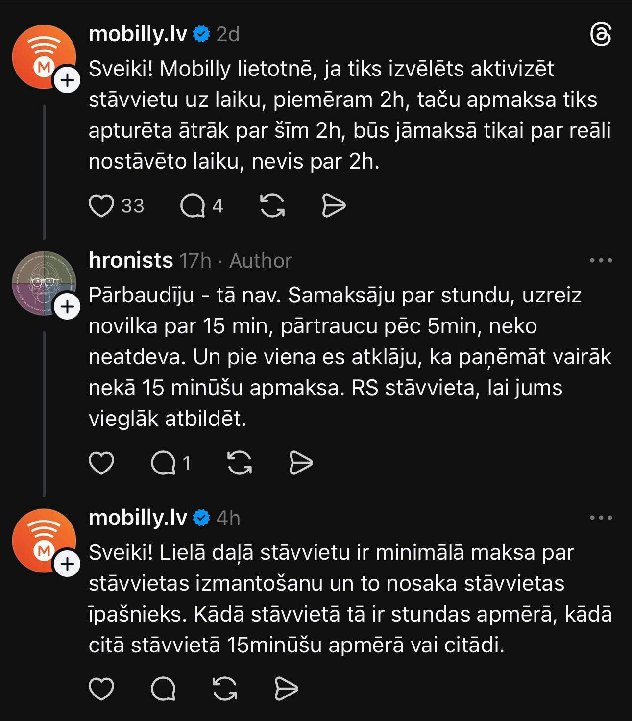 Komentāru sadaļā “Mobilly” gan skaidro, ka arī viņu aplikācijā ir šāda opcija. “Mobilly lietotnē, ja tiks izvēlēts aktivizēt stāvvietu uz laiku, piemēram, 2h, taču apmaksa tiks apturēta ātrāk par šīm 2h, būs jāmaksā tikai par reāli nostāvēto laiku, nevis 2h,” skaidro uzņēmuma pārstāvji.
