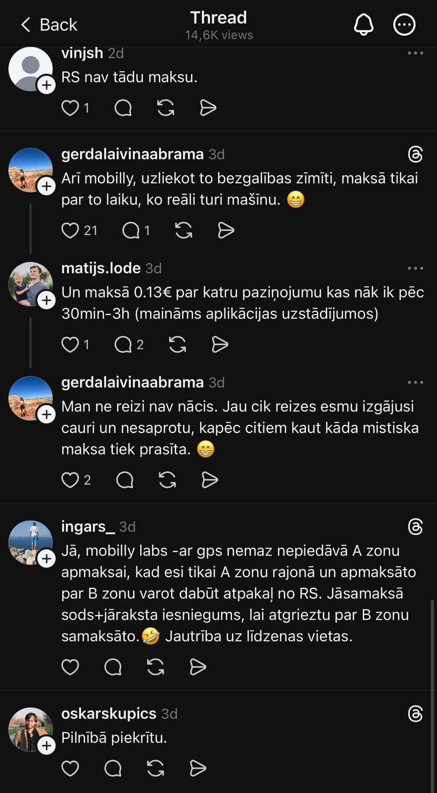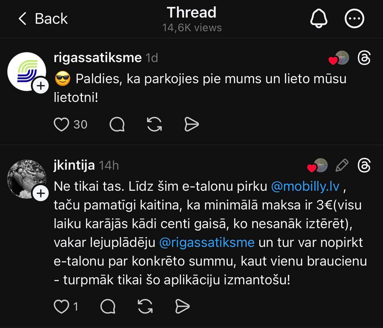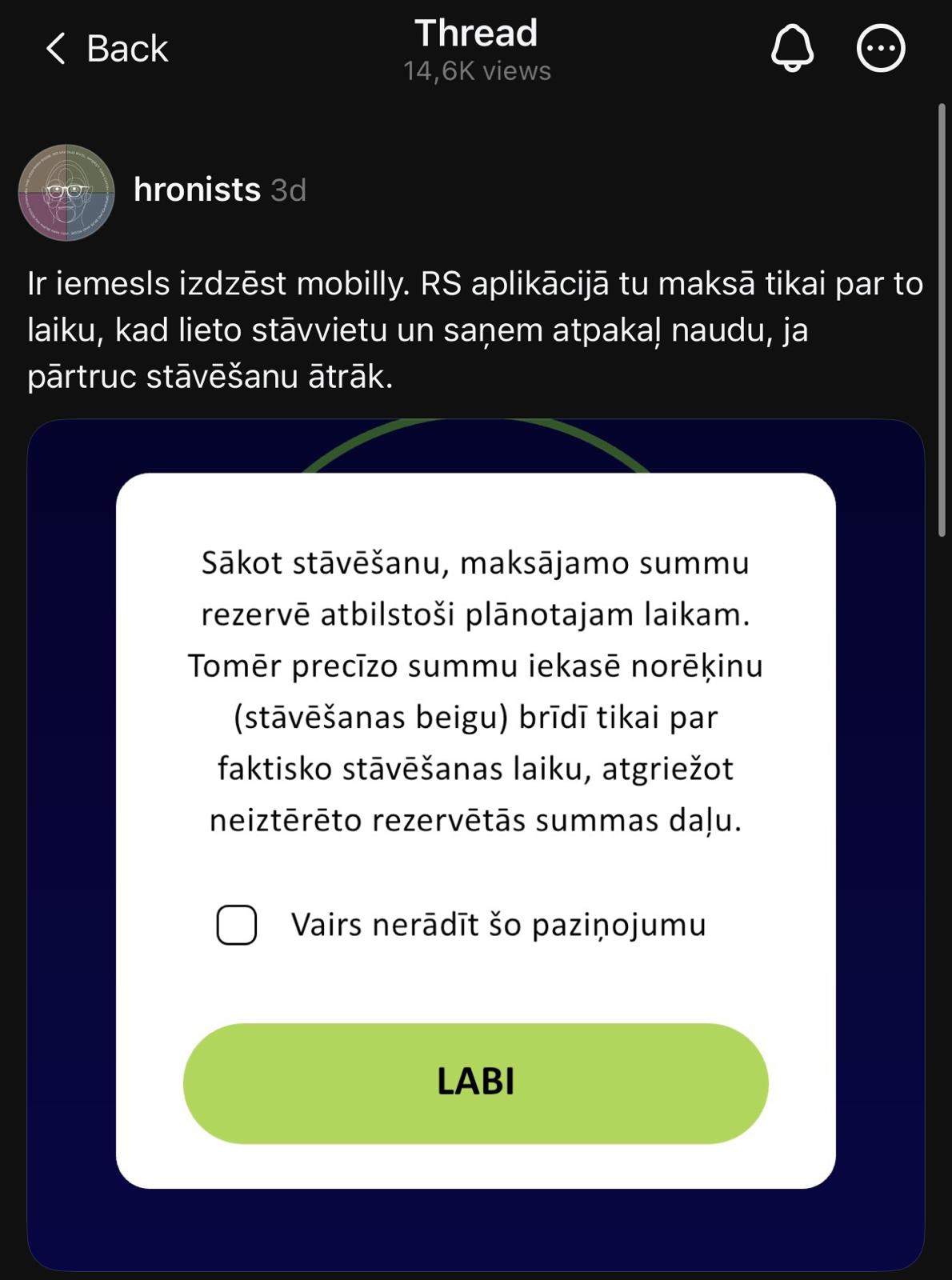 Jau iepriekš LA.LV esam rakstījuši par dažādām likstām aplikācijā “Mobilly”. Piemēram, ka aplikācijā jāmaksā par atgādinājumu saņemšanu. Turpretī kāds soctīklotājs uzteic “Rīgas satiksmes” aplikāciju. Viņš raksta: “Ir iemesls izdzēst Mobilly. Rīgas satiksmes aplikācijā tu maksā tikai par to laiku, kad lieto stāvvietu un saņem atpakaļ naudu, ja pārtrauc stāvēšanu ātrāk.”