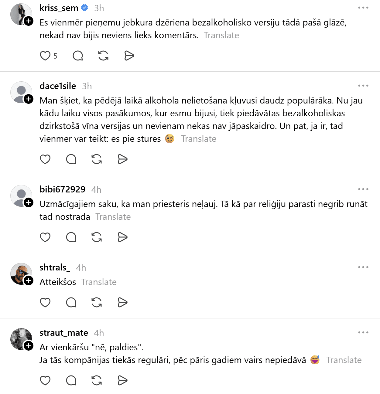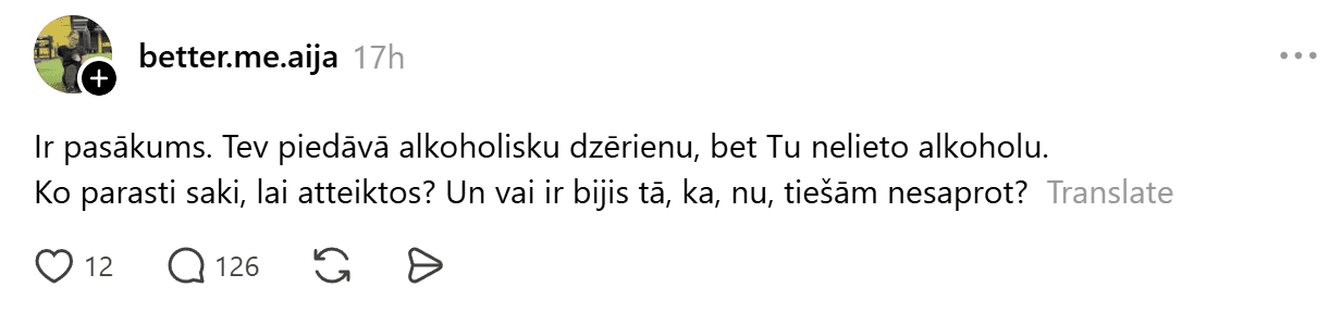 Kāda soctīkla lietotāja aizsāka diskusiju rakstot: “Ir pasākums. Tev piedāvā alkoholisku dzērienu, bet tu nelieto alkoholu. Ko parasti saki, lai atteiktos? Un vai ir bijis tā, ka, nu, tiešām nesaprot?”
