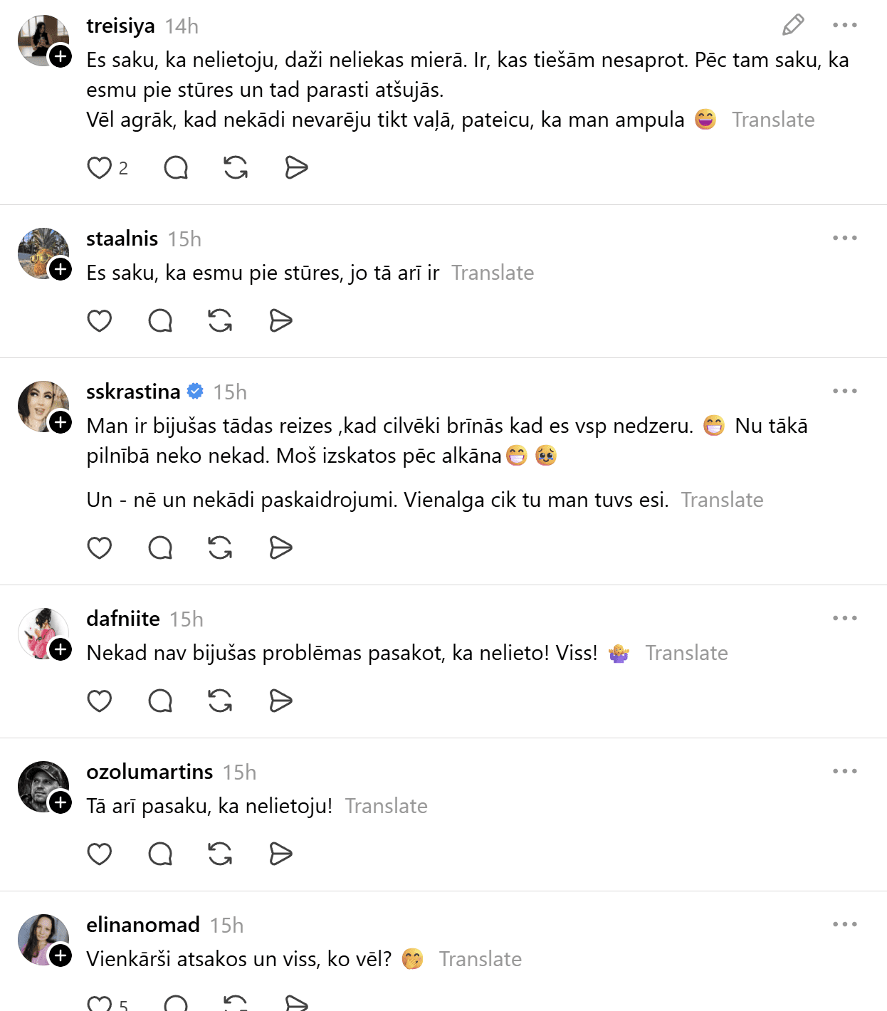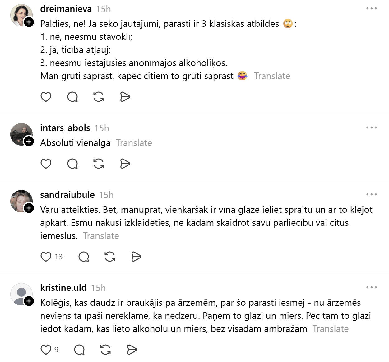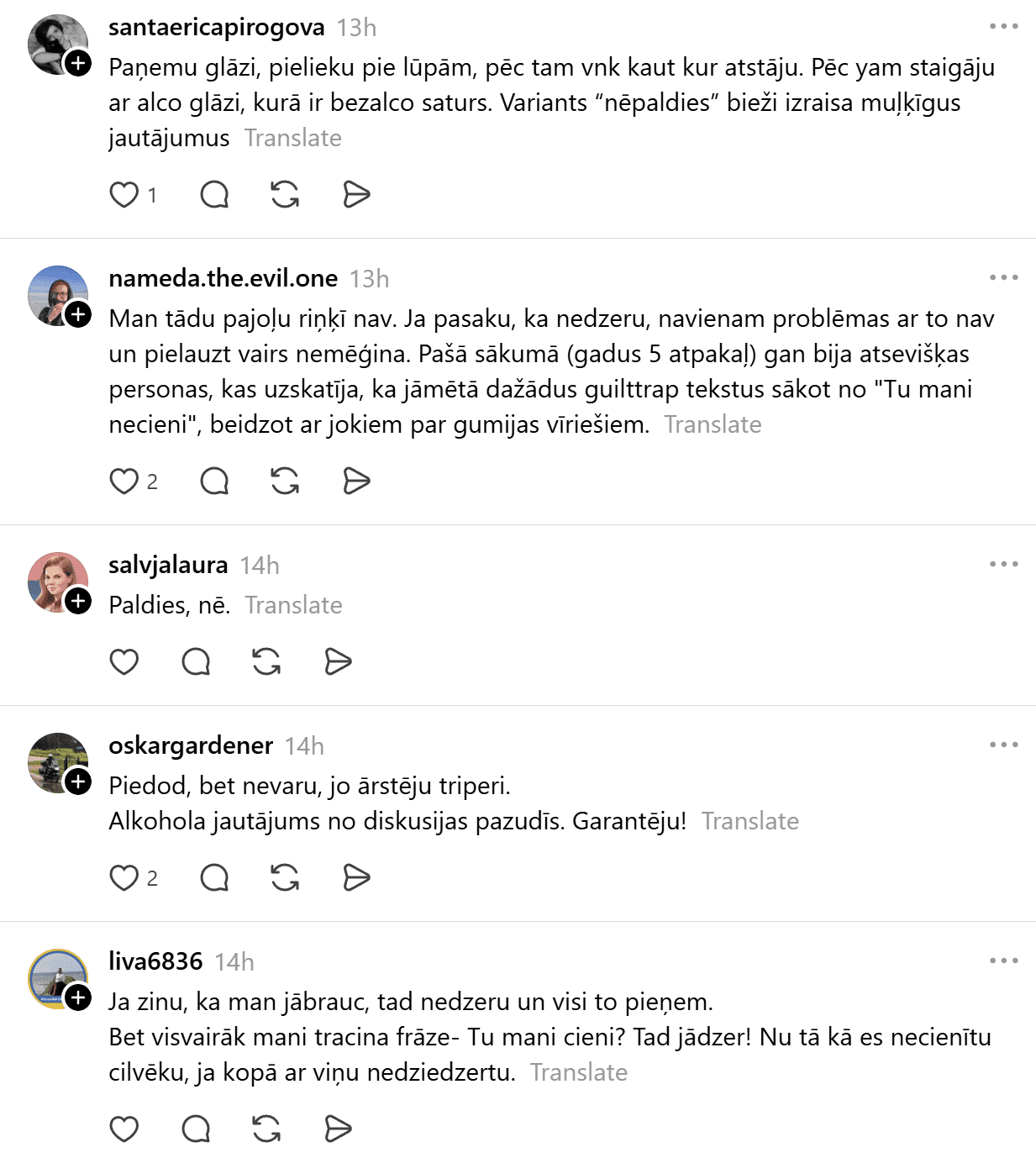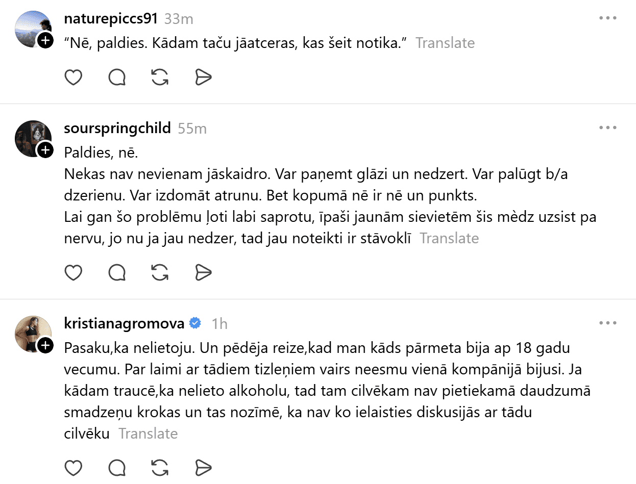 Komentāros cilvēki aktīvi dalās ar savu pieredzi. Daudzi atzīst, ka atteikties no alkohola sabiedrībā joprojām ne vienmēr ir vienkārši. Citi uzsver, ka nav nevienam parādā nekādus paskaidrojumus – nē un viss!