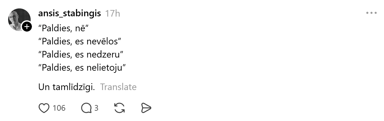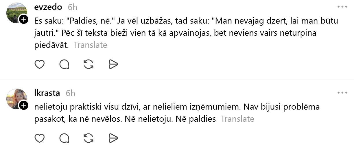 Piemēram, vietnē “Threads” lasāma diskusija, kā atteikties publiskos pasākumos no alkohola lietošanas.