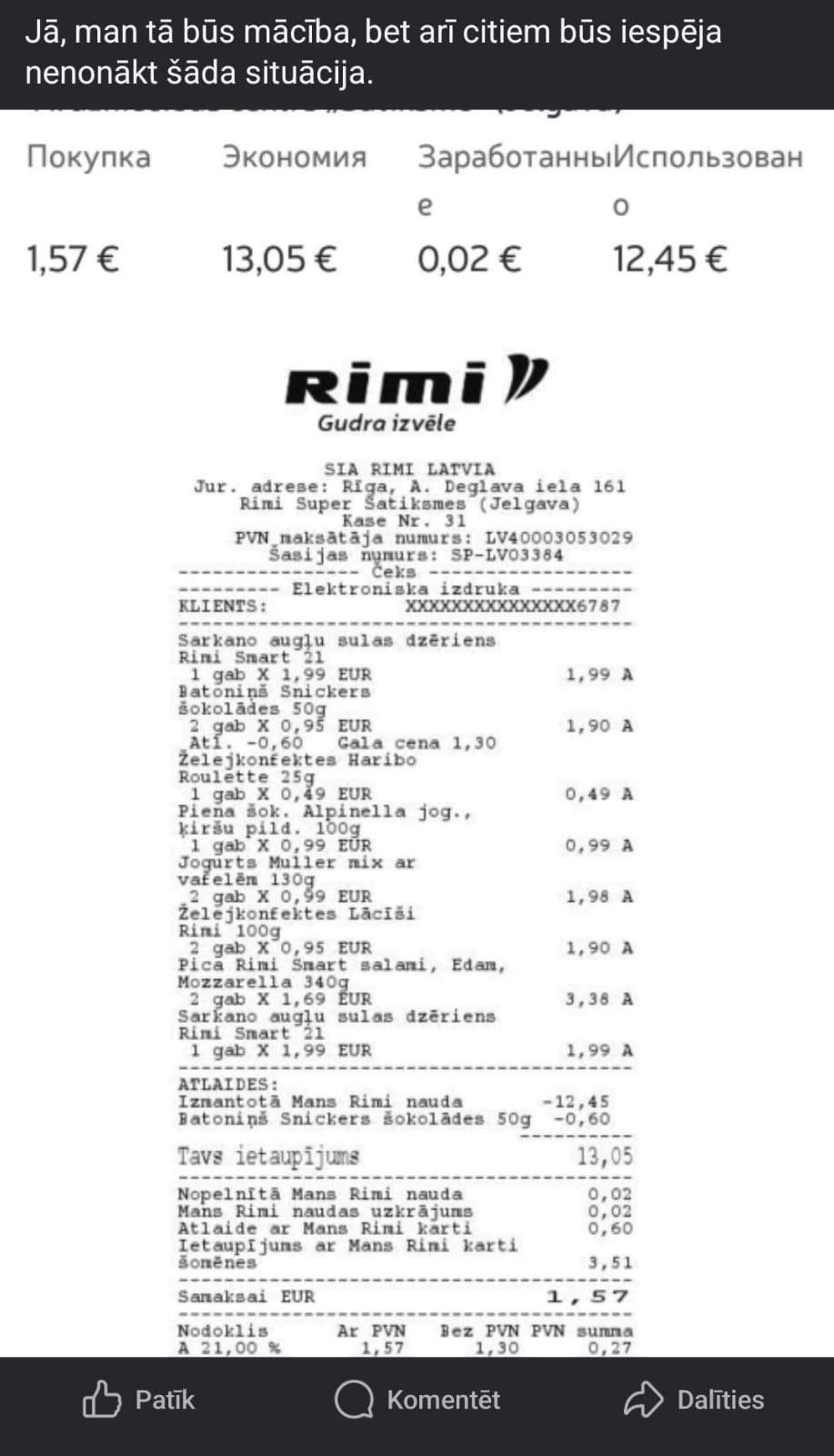 “Notikusi ne visai forša situācija, veikalā. Jā, pati vainīga, un piedodiet vairs savas labestības dēļ nedošu savas veikala kartes, kurās tiek uzkrāta naudiņa. Jā, varbūt summa nav liela. Bet, man ir 2 bērni un uzkrājumu es varētu iztērēt uz viņiem.