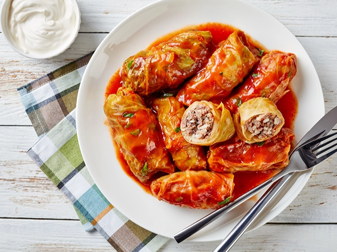 Šo maisījumu ietin kāpostu lapās, liek cepamtraukā ar biezu dibenu, pārlej atlikušo tomātu mērci un sautē līdz gatavībai. Pirms pasniegšanas pārlej ar bezpiedevu jogurtu.