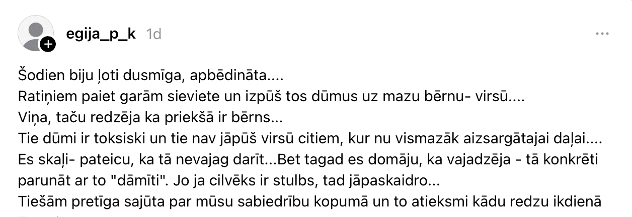 Viņa raksta: “Šodien biju ļoti dusmīga, apbēdināta… Ratiņiem paiet garām sieviete un izpūš dūmus virsū mazam bērnam. Viņa taču redzēja, ka priekšā ir bērns… Tie dūmi ir toksiski, un tie nav jāpūš virsū citiem, kur nu vēl vismazāk aizsargātajai sabiedrības daļai… Es skaļi pateicu, ka tā nevajag darīt… Bet tagad domāju, ka vajadzēja konkrēti parunāt ar to “dāmīti”. Jo, ja cilvēks ir stulbs, tad jāpaskaidro… Tiešām pretīga sajūta par mūsu sabiedrību kopumā un to attieksmi, kādu redzu ikdienā.”