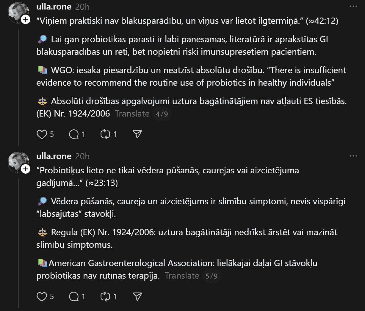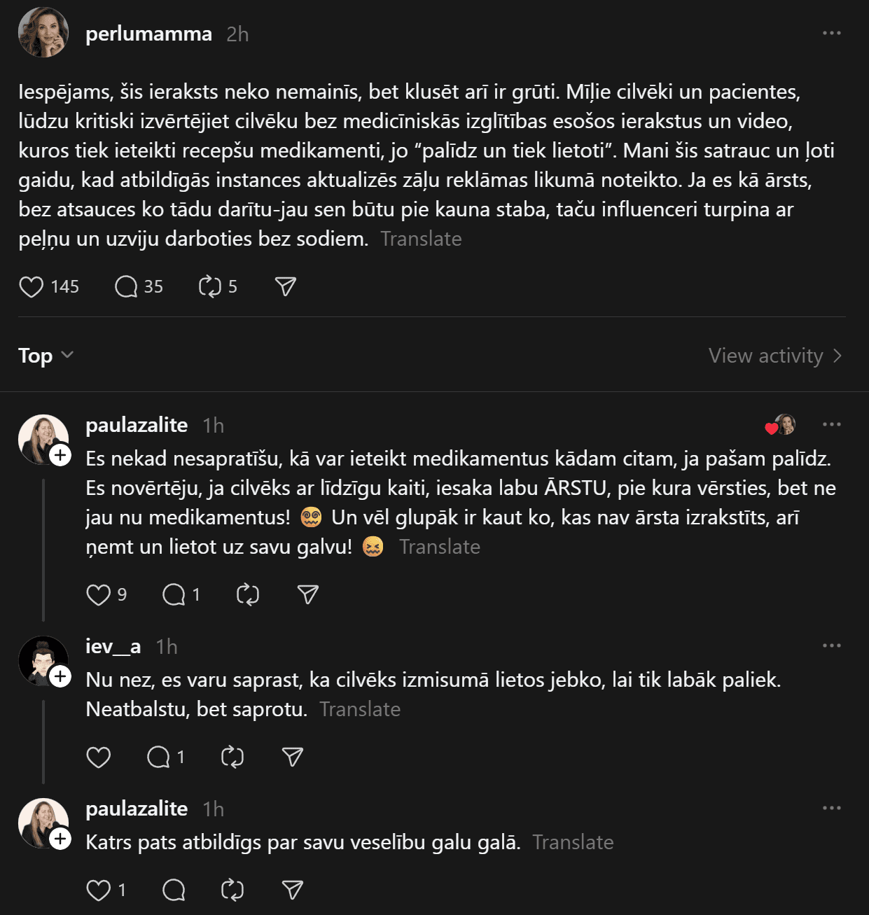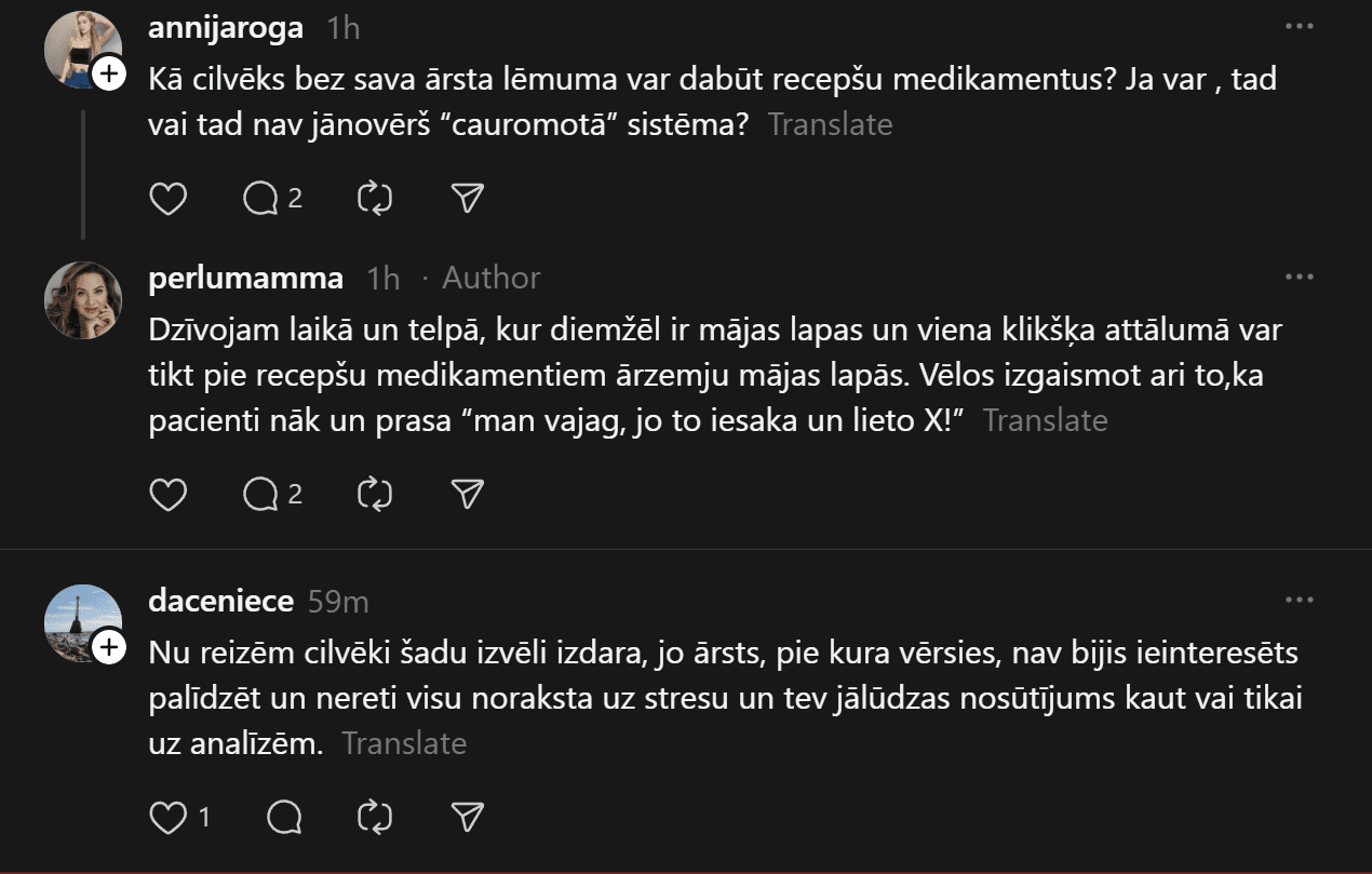 “Iespējams, šis ieraksts neko nemainīs, bet klusēt arī ir grūti. Mīļie cilvēki un pacientes, lūdzu kritiski izvērtējiet cilvēku bez medicīniskās izglītības esošos ierakstus un video, kuros tiek ieteikti recepšu medikamenti, jo “palīdz un tiek lietoti”. Mani šis satrauc un ļoti gaidu, kad atbildīgās instances aktualizēs zāļu reklāmas likumā noteikto. Ja es kā ārsts, bez atsauces ko tādu darītu-jau sen būtu pie kauna staba, taču influenceri turpina ar peļņu un uzviju darboties bez sodiem,” viņa raksta “Threads”.
