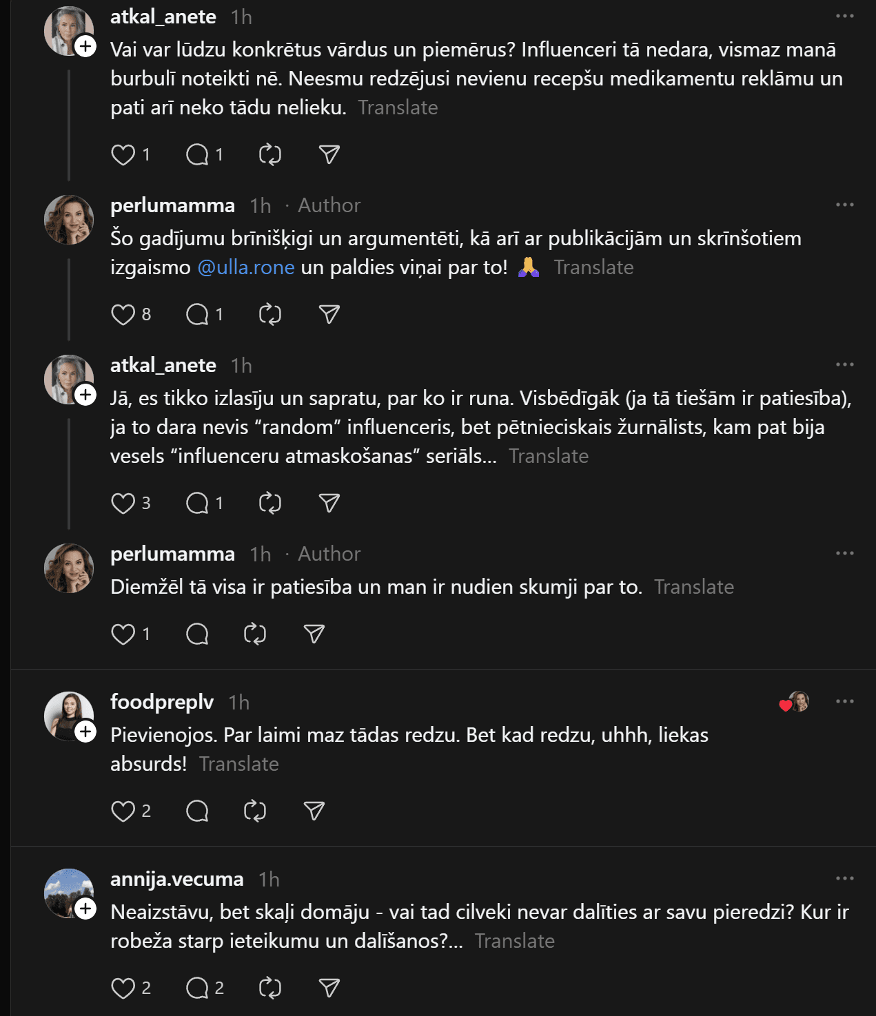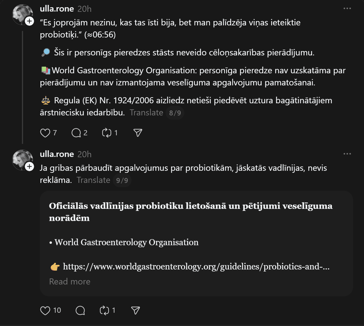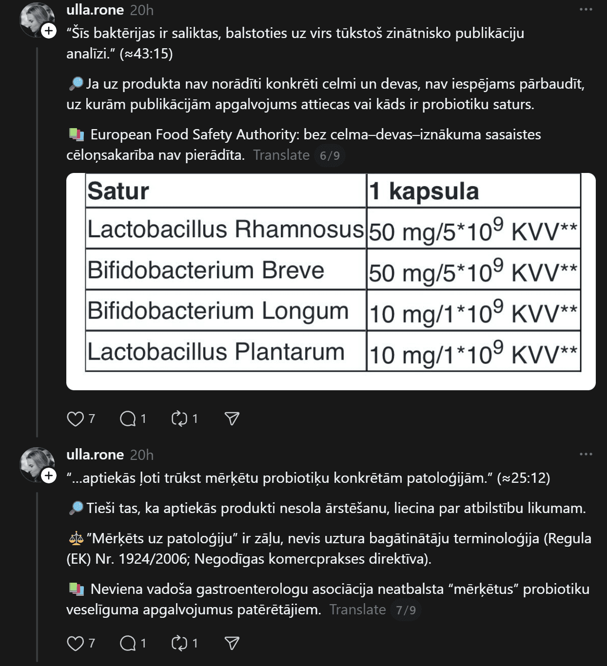 “Iespējams, šis ieraksts neko nemainīs, bet klusēt arī ir grūti. Mīļie cilvēki un pacientes, lūdzu kritiski izvērtējiet cilvēku bez medicīniskās izglītības esošos ierakstus un video, kuros tiek ieteikti recepšu medikamenti, jo “palīdz un tiek lietoti”. Mani šis satrauc un ļoti gaidu, kad atbildīgās instances aktualizēs zāļu reklāmas likumā noteikto. Ja es kā ārsts, bez atsauces ko tādu darītu-jau sen būtu pie kauna staba, taču influenceri turpina ar peļņu un uzviju darboties bez sodiem,” viņa raksta “Threads”.