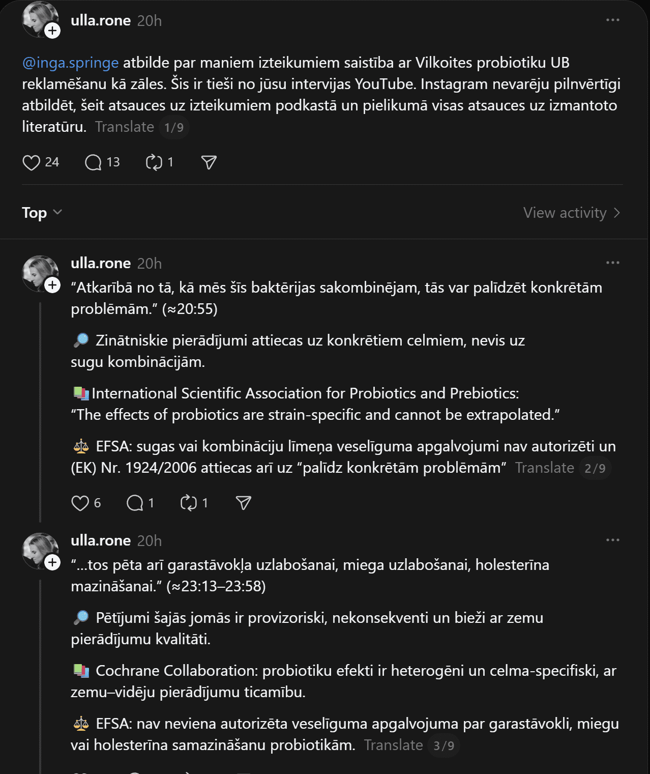 Konkrētas personas tieši Puriņas-Libertes ierakstā nav minētas, tomēr komentārā viņa norāda uz kādu citu profilu, kur tiek runāts tieši par Ingas Spriņģes reklamētajiem uztura bagātinātājiem.