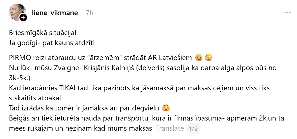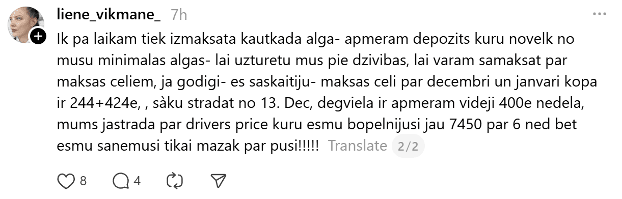 Viņa norāda: “Ik pa laikam tiek izmaksāta kaut kāda alga – apmēram depozīts, kuru novelk no mūsu minimālās algas, lai uzturētu mūs pie dzīvības, lai varam samaksāt par maksas ceļiem, ja godīgi – es saskaitīju – maksas ceļi par decembri un janvāri kopā ir 244 + 424 eiro, sāku strādāt no 13. decembra, degviela ir apmēram vidēji 400 eiro nedēļā, mums jāstrāda par “drivers price”, kuru esmu nopelnījusi jau 7450 par 6 nedēļām, bet esmu saņēmusi tikai mazāk par pusi!”