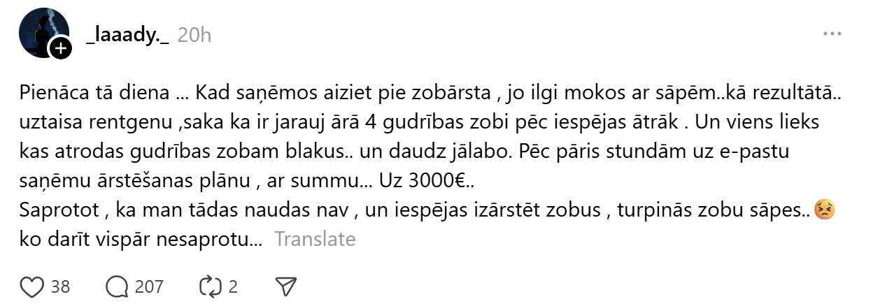 Soctīklos izpelnījies uzmanību kāds ieraksts, kas izgaismo nopietnu problēmu Latvijā. Kāda sieviete, ilgstoši ciezdama no zobu sāpēm, beidzot devusies pie zobārsta. Viņa uzzinājusi, ka nepieciešama vairāku gudrības zobu raušana un citu zobu labošana. Pēc vizītes viņas e-pastā iekritis ārstēšanas plāns ar biedējošu summu – ap 3000 eiro.