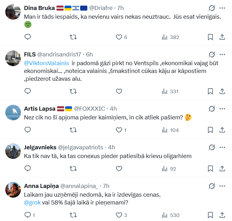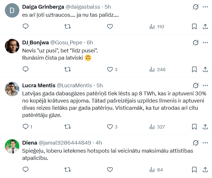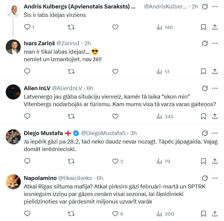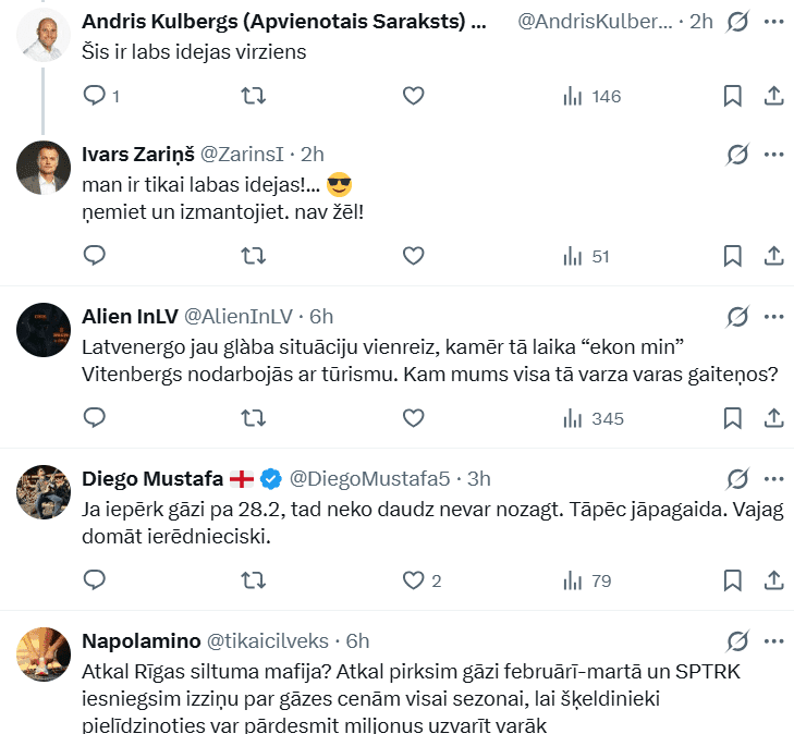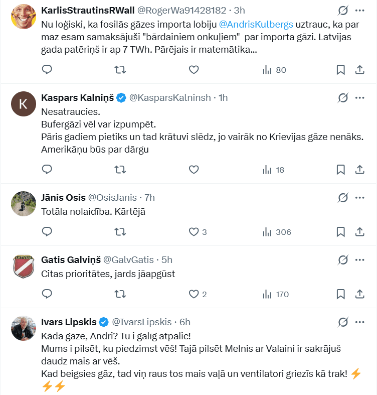 “Mani vienīgo uztrauc, ka mūsu Conexus Inčukalna gāzes krātuve ir tikai piepildīta uz pusi par 58% pirms ziemas apkures sezonas! Līdz ar to ļoti ierobežots uzglabāšanas apjoms arī turpmāk. Jau nav redzamas ka SDG termināļu papildinājuma – pašlaik nav (varbūt būs?) = krājumi strauji samazinās, jo krātuvi izmanto visa Baltija, Somija, Polija un citi. Ja šādos tempos tiks tukšota gāzes krātuve, pat 3 mēnešus neizvilksim. Vēl jau LV it kā pietiek, bet par drošu, nodrošinātu energoapgādi ir jādomā. Kas to dara? Viktors Valainis par to ir domājis?