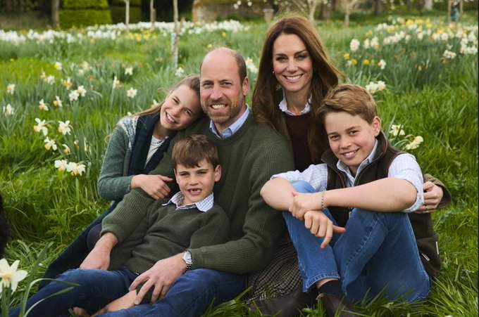 Fotogrāfijā redzami princis Viljam un Keita Midltone, sēžot starp narcisēm zālē kopā ar saviem trim bērniem – Prinčiem Džordžu, Luisu un princesi Šarloti. Šarlote pieglaudusies tēvam un tur viņa roku, Luiss draismi sēž pie tēta kājām, savukārt Keita ar roku apskāvusi Džordžu.