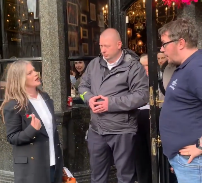 Video redzams apsargs, kurš nostājies priekšā restorāna durvīm. Sieviete uzbrūkošā tonī viņam saka: “Ja tas būtu ASV karogs vai Apvienotās Karalistes karogs, vai Ukrainas karogs, vai varavīksnes karogs, jūs man neliktu to noņemt!” Vīrietis, kurš stāv blakus apsargam atbild: “Jā, mēs liktu!” “Nē, jūs mani neapturētu,” sieviete pieturas pie savas pārliecības.