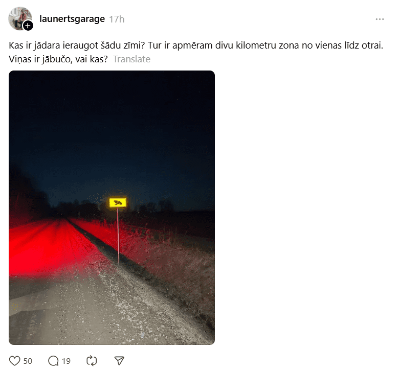 Kāds autovadītājs uz grants ceļa pamanījis neparastu ceļa zīmi, uz kuras redzams krupis. “Kas ir jādara, ieraugot šādu zīmi? Tur ir apmēram divu kilometru zona no vienas līdz otrai. Viņas ir jābučo, vai kas?” viņš vaicā sociālo tīklu platformā “Threads”.