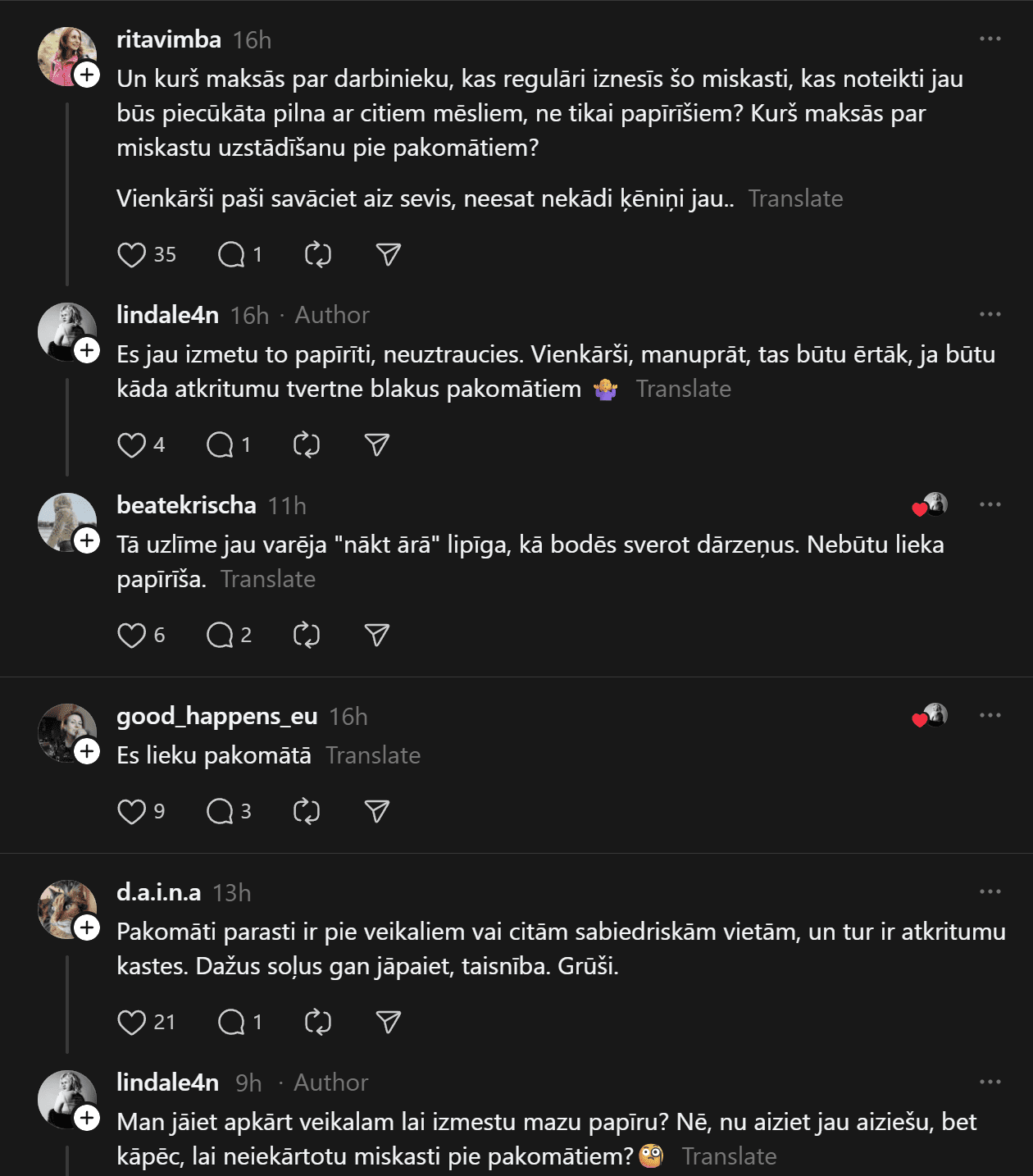 Tomēr ne visi ir tik kategoriski. Daudzi uzskata, ka neliela atkritumu tvertne pie pakomāta būtu loģisks risinājums. “Es jau izmetu to papīrīti, bet būtu ērtāk, ja blakus būtu atkritumu tvertne,” raksta ieraksta autore. Citi piekrīt: “Pakomāti parasti ir pie veikaliem vai sabiedriskām vietām, bet jā – dažus soļus gan jāpaiet. Grūši.”
