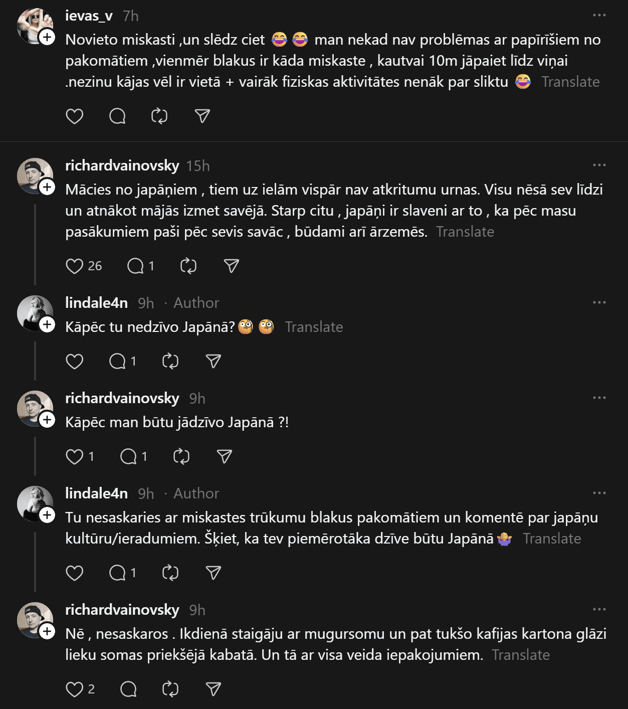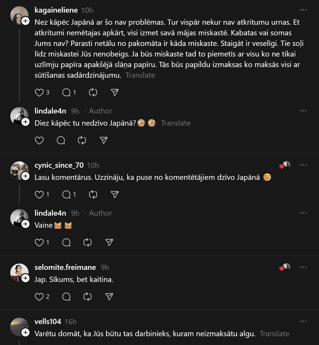 Kāds raksta: “Vienkārši paši savāciet aiz sevis, neesat nekādi ķēniņi.” Cits piebilst, ka citās valstīs tas esot normāli: “Mācīsimies no japāņiem – tur uz ielām vispār nav atkritumu urnu. Visi nes sev līdzi un izmet mājās.”