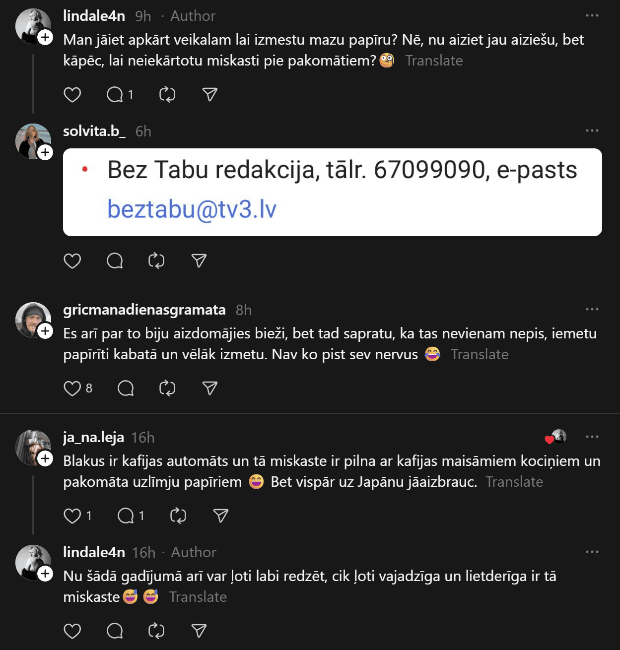 Daļa diskusijas dalībnieku gan brīdina – ja miskastes būs, tās ātri vien pārvērtīsies par haosu. “Kurš maksās par darbinieku, kas regulāri iznesīs šo miskasti? Tā noteikti būs pilna ar visādiem mēsliem, ne tikai papīriem,” norāda kāda komentētāja.