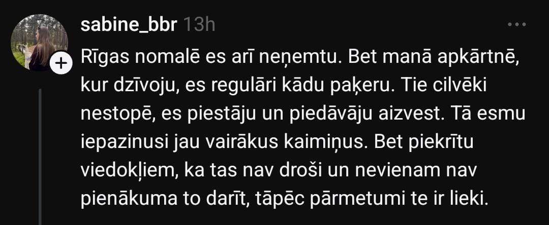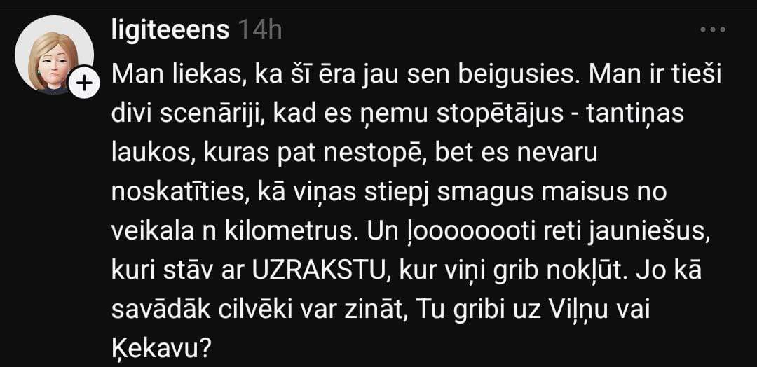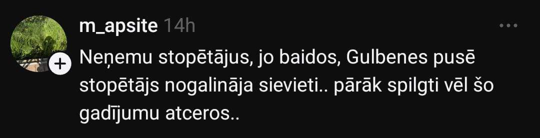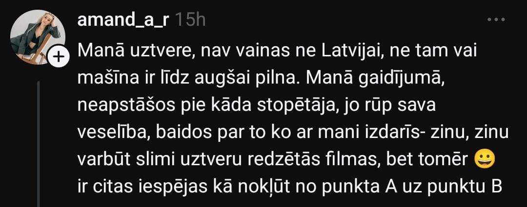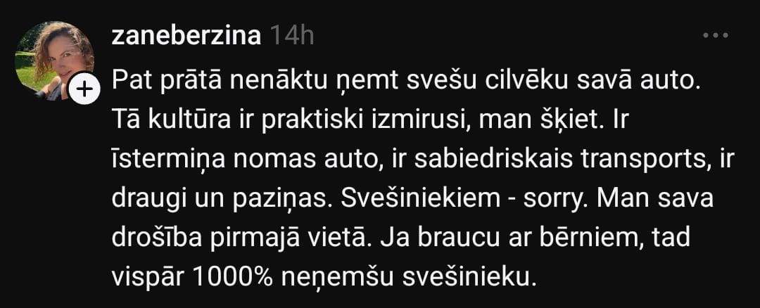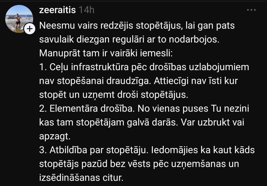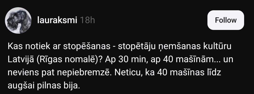 Sociālo mediju platformā “Threads” Laura pievēršas šim jautājumam un raksta: “Kas notiek ar stopēšanas jeb stopētāju uzņemšanas kultūru Latvijā (Rīgas nomalē)? 30 minūtēs ap 40 mašīnām — un neviens pat nepiebremzē. Neticu, ka visas 40 bija pilnas.”