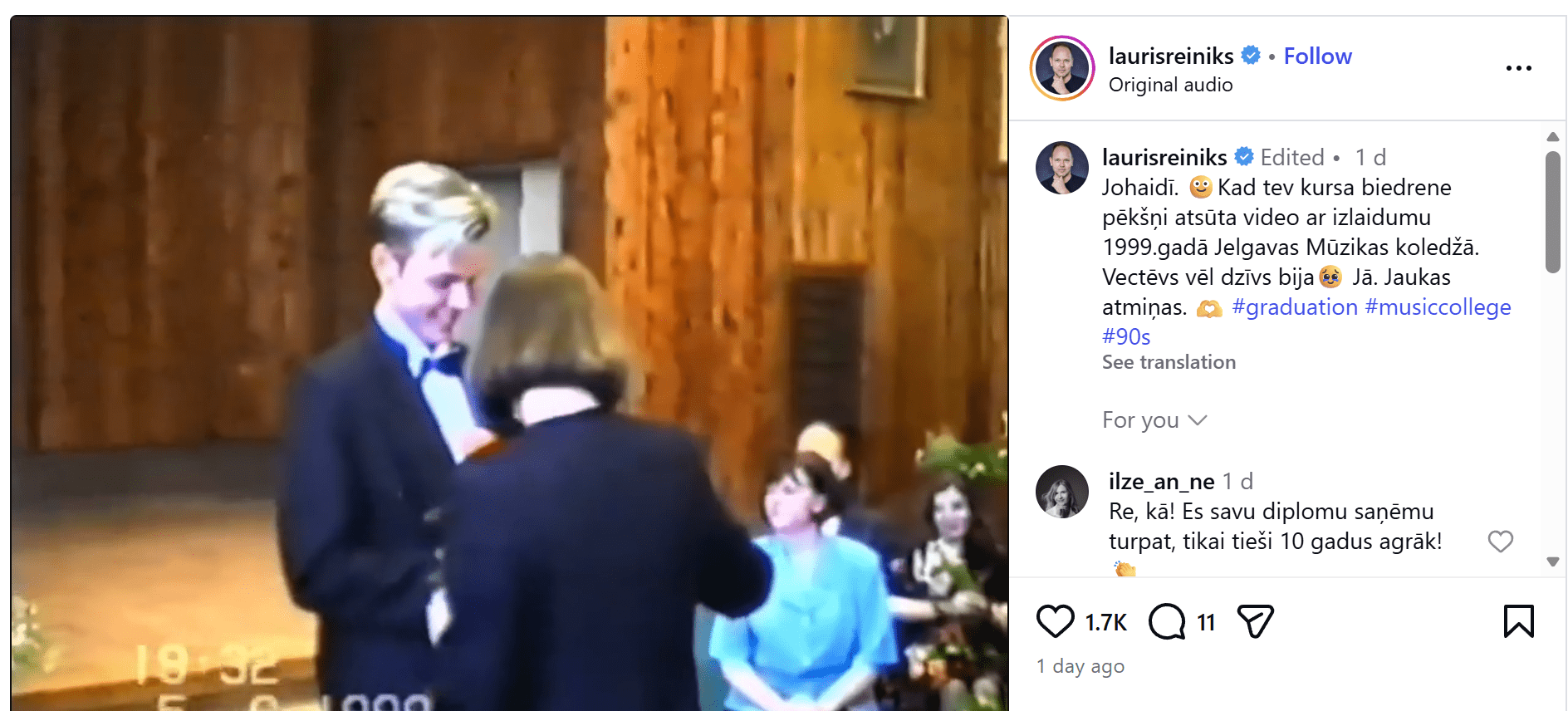 Publicējot video sociālo tīklu platformā “Instagram” Lauris raksta: “Johaidī. Kad tev kursa biedrene pēkšņi atsūta video ar izlaidumu 1999. gadā Jelgavas Mūzikas koledžā. Vectēvs vēl dzīvs bija. Jā. Jaukas atmiņas.”