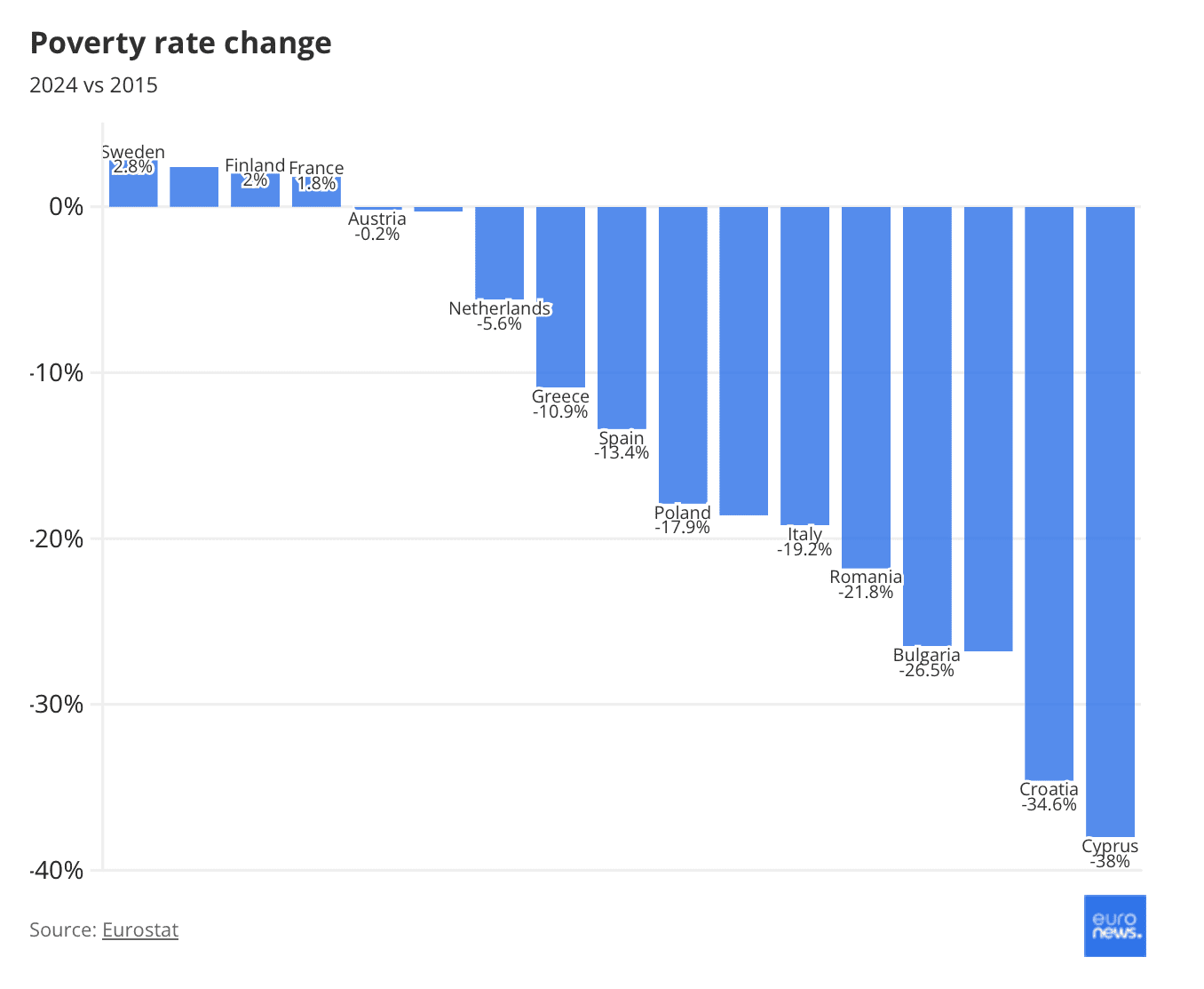 Tajā pašā laikā daudzās Austrumeiropas un Dienvideiropas valstīs nabadzības rādītāji ir samazinājušies par desmitiem procentpunktu. Kipra ir līdere ES (-38%), tai seko Horvātija (34.6%), Ungārija (26.8%), Bulgārija (26.5%) un Rumānija (21.8%). Kopējais nabadzības līmenis ES tagad ir 17.4%, kas nozīmē, ka gandrīz diviem no desmit cilvēkiem ir nopietnas grūtības iztikt, lai izdzīvotu.