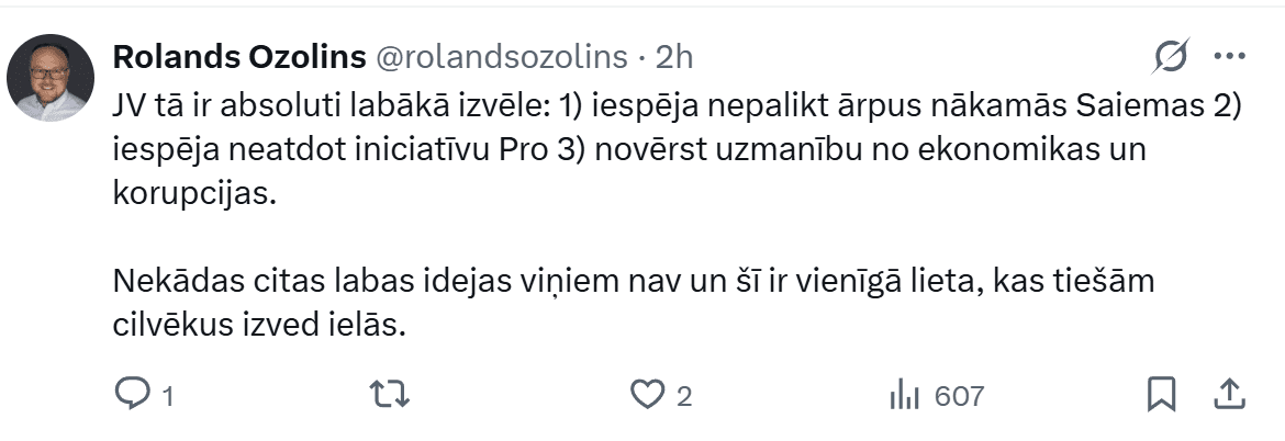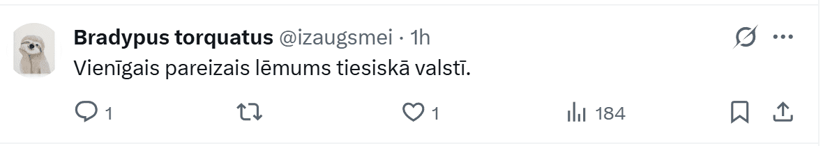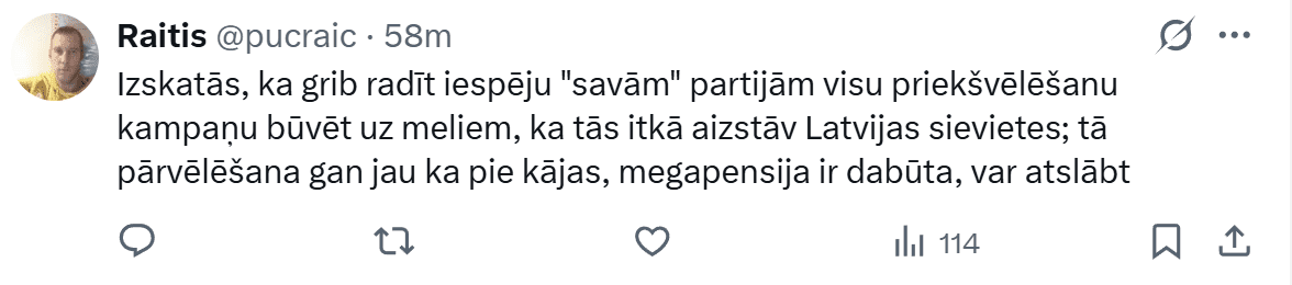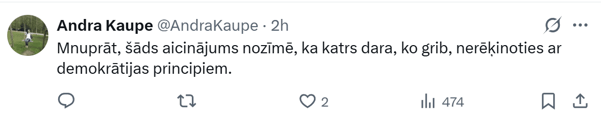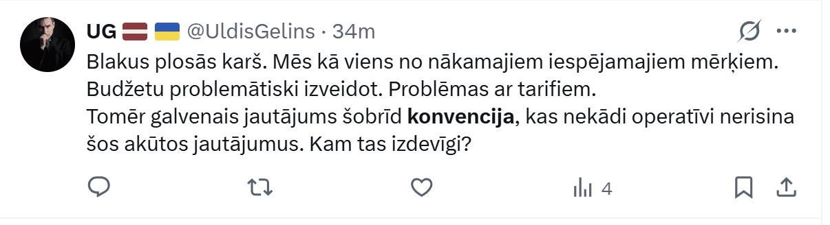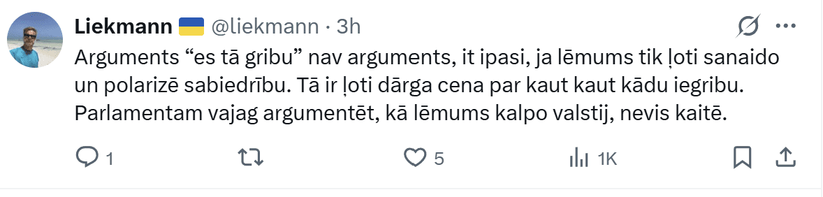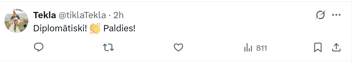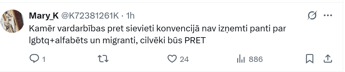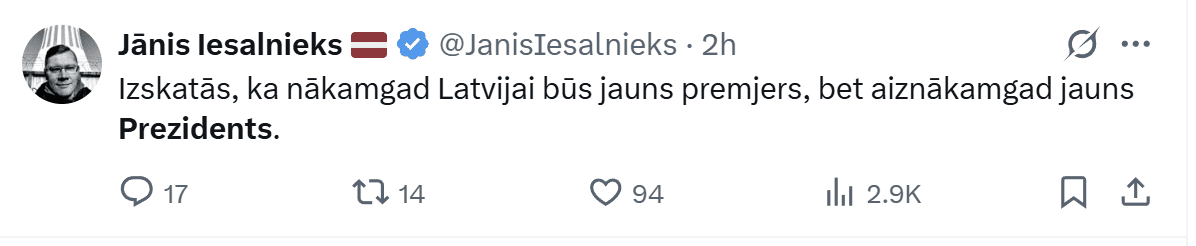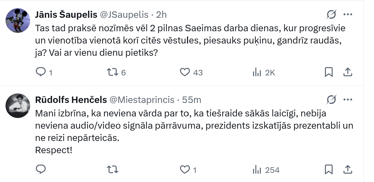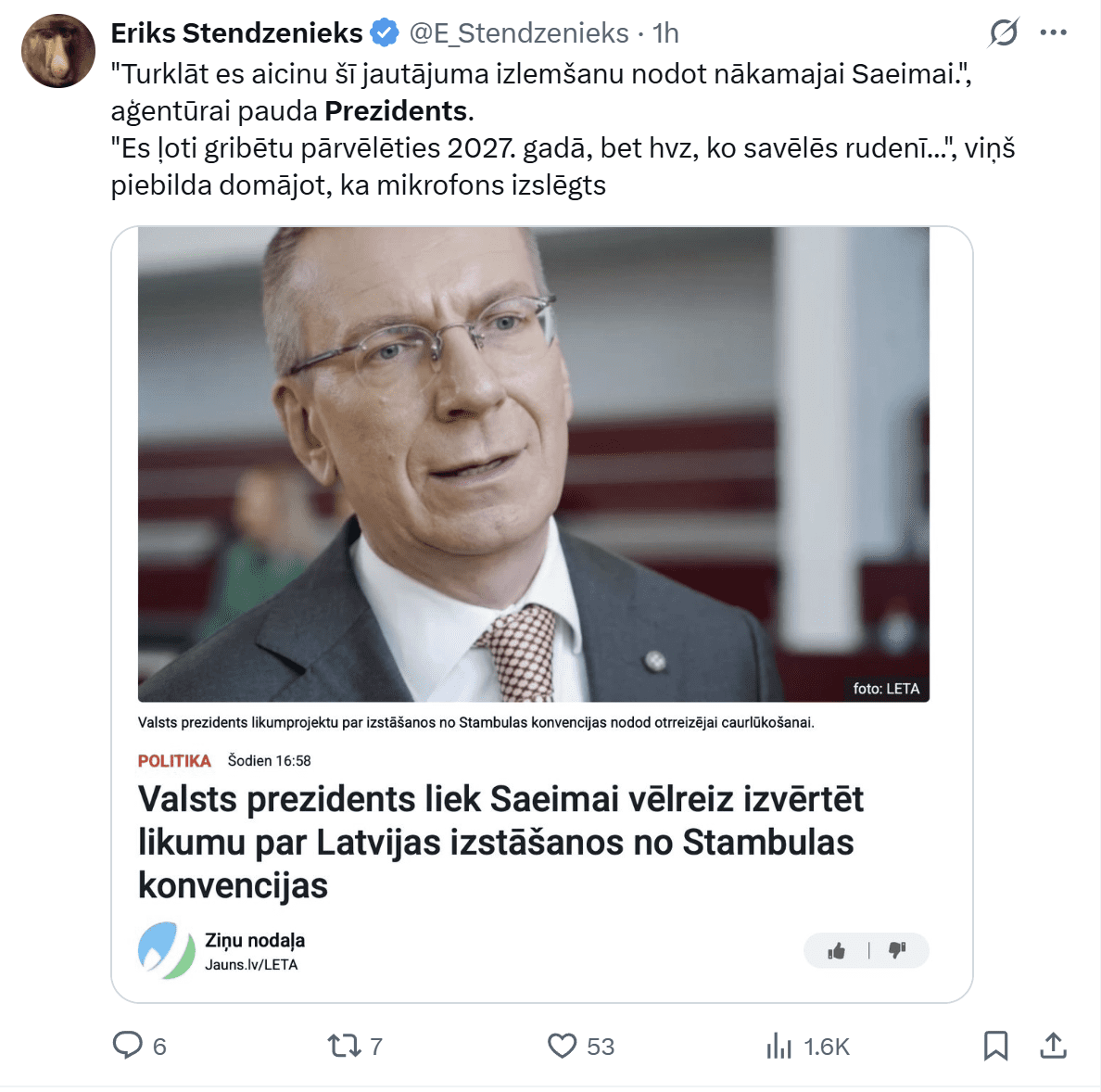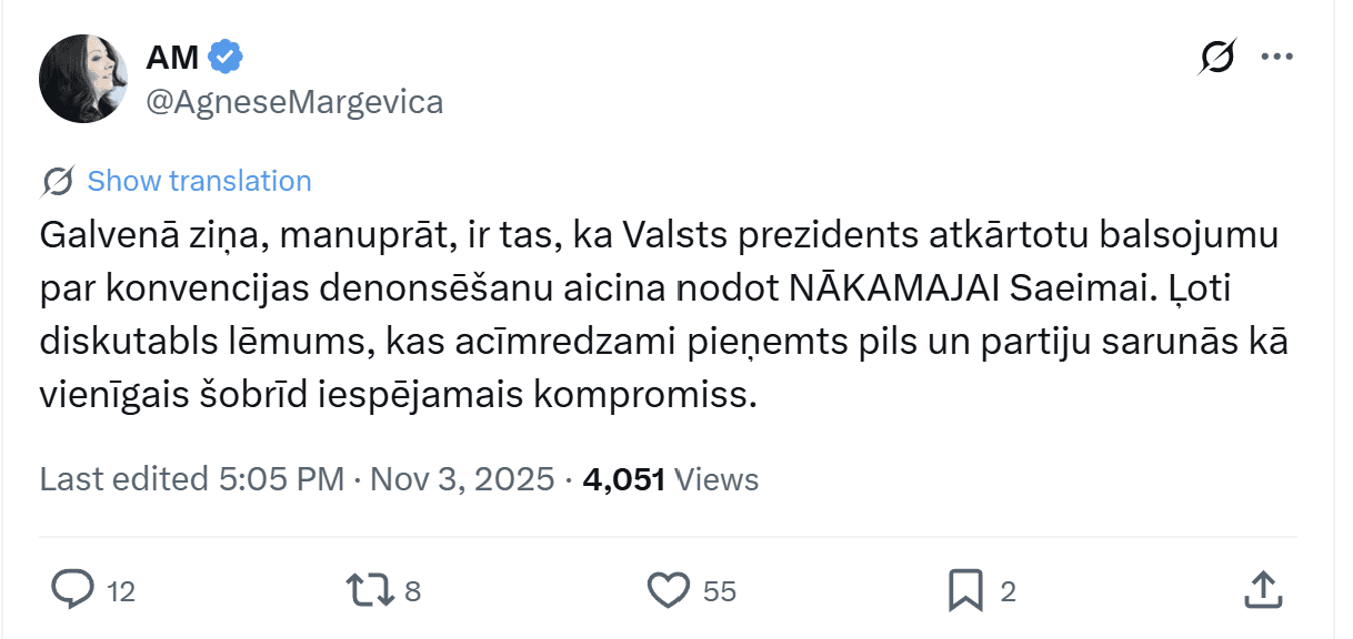 “Galvenā ziņa, manuprāt, ir tas, ka Valsts prezidents atkārtotu balsojumu par konvencijas denonsēšanu aicina nodot NĀKAMAJAI Saeimai. Ļoti diskutabls lēmums, kas acīmredzami pieņemts pils un partiju sarunās kā vienīgais šobrīd iespējamais kompromiss,” savu viedokli tērzēšanas platformā “X” pauž Agnese.