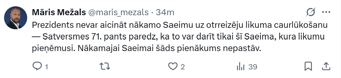 Turklāt prezidents aicina šī jautājuma izlemšanu nodot nākamajai Saeimai. Nākamās parlamenta vēlēšanas notiks 2026. gada rudenī.