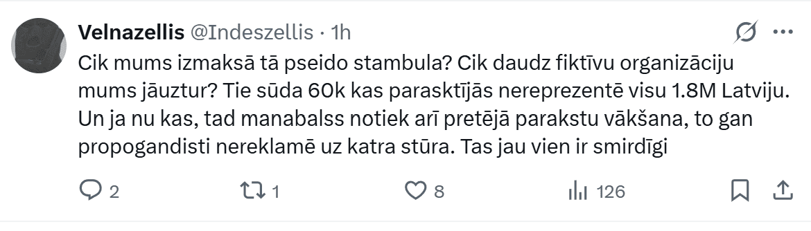 Savukārt platformā “ManaBalss.lv” par Valsts prezidentam paredzētu iniciatīvu, aicinot viņu neizsludināt šo likumu, nepilnu četru dienu laikā parakstījušies vairāk nekā 63 000 cilvēku. Tikmēr Saeimā jau iesniegtajā iniciatīvā, kurā parlaments aicināts turpināt dalību konvencijā, parakstu skaits sasniedzis vismaz 33 000.