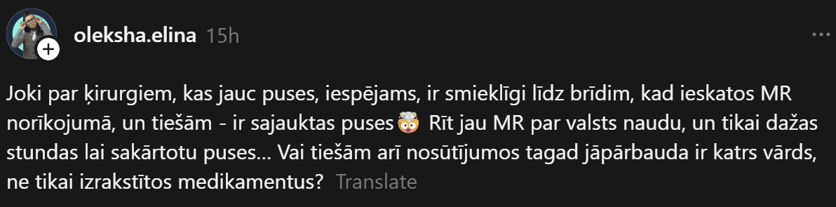 “Joki par ķirurgiem, kas jauc puses, iespējams, ir smieklīgi līdz brīdim, kad ieskatos MR norīkojumā, un tiešām – ir sajauktas puses. Rīt jau MR par valsts naudu, un tikai dažas stundas lai sakārtotu puses… Vai tiešām arī nosūtījumos tagad jāpārbauda ir katrs vārds, ne tikai izrakstītos medikamentus?” vietnē “Threads” raksta Elīna.