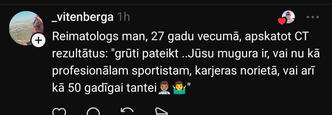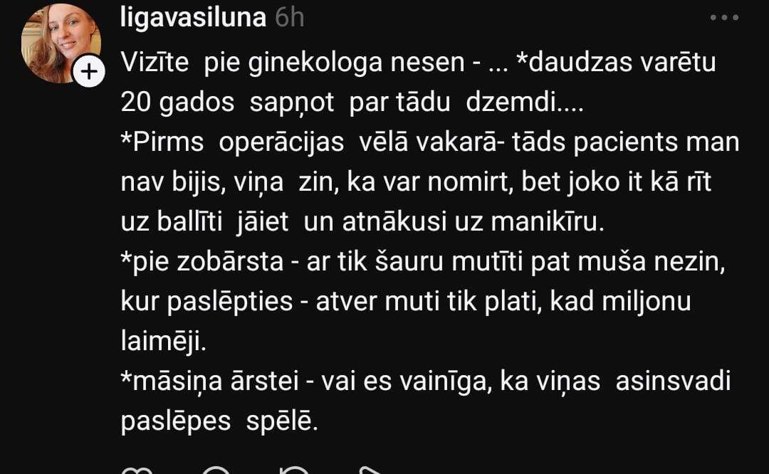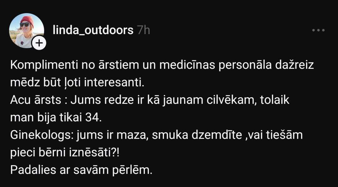 Linda sociālo mediju platformā “Threads” uzsāk interesantu diskusiju un raksta: “Komplimenti no ārstiem un medicīnas personāla dažreiz mēdz būt ļoti interesanti. Acu ārsts : Jums redze ir kā jaunam cilvēkam, tolaik man bija tikai 34. Ginekologs: jums ir maza, smuka dzemdīte ,vai tiešām pieci bērni iznēsāti?! Padalies ar savām pērlēm.”