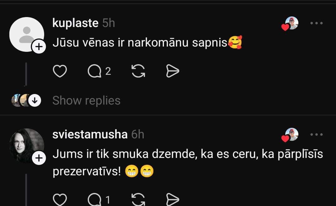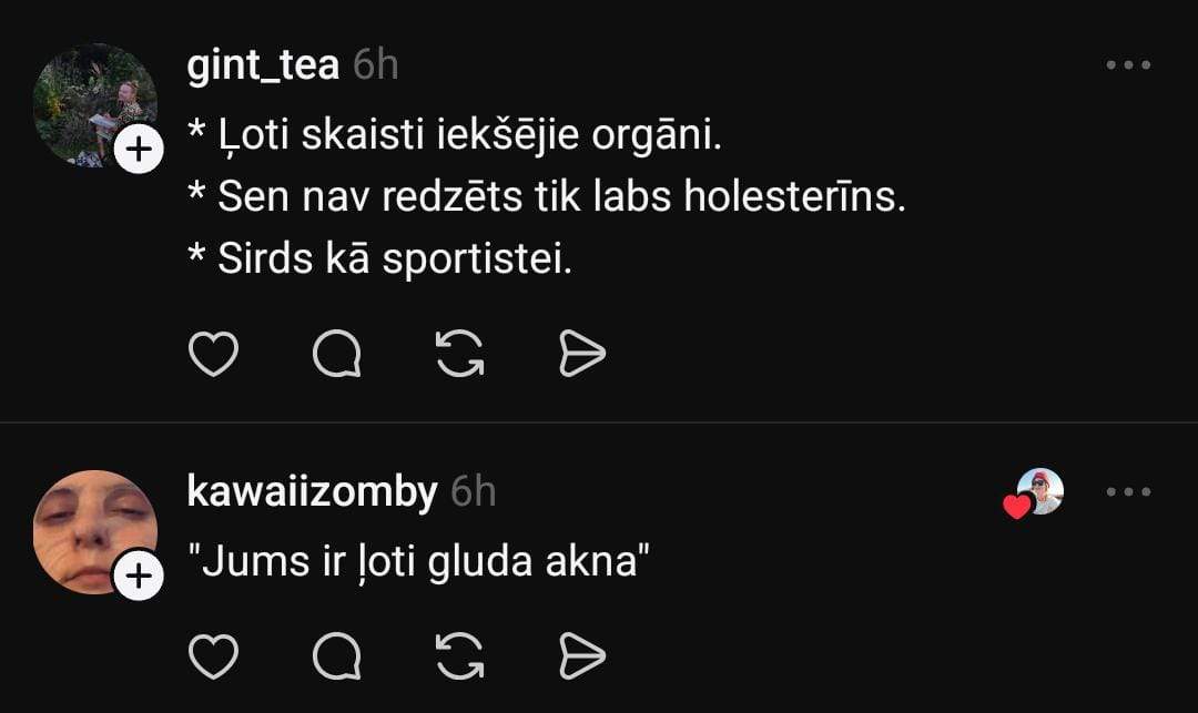 Lietotāja ar segvārdu @liesma123 papildina komentāru sadaļu: “Pec histeroskopijas – zināji ka tev ir sirds formas dzemde? Tik skaistu sirds formas dzemdi nebiju redzējusi.”
