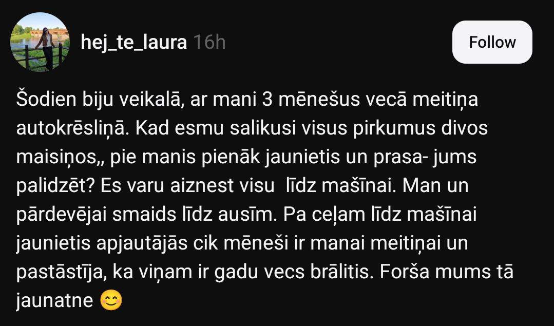 “Šodien biju veikalā ar savu trīs mēnešus veco meitiņu autokrēsliņā. Kad biju salikusi visus pirkumus divos maisiņos, pie manis pienāk jaunietis un prasa: “Jums palīdzēt? Es varu aiznest visu līdz mašīnai.” Man un pārdevējai smaids līdz ausīm,” viņa raksta.