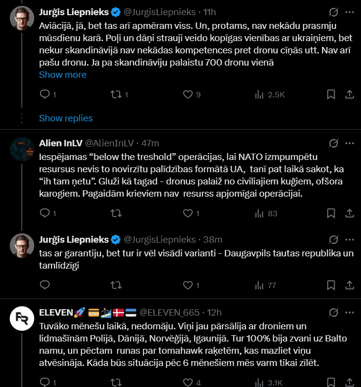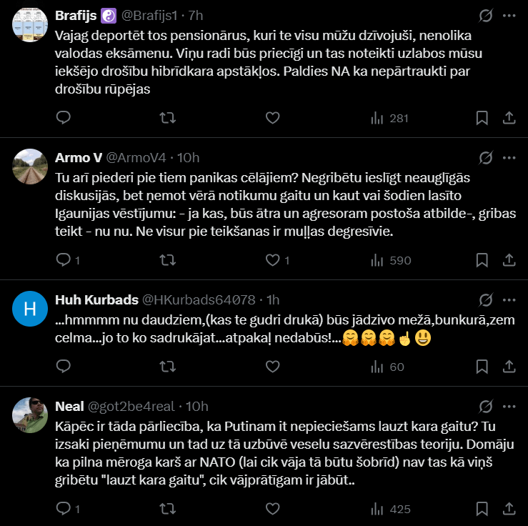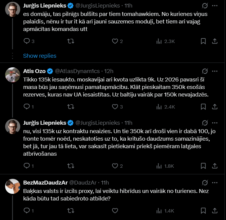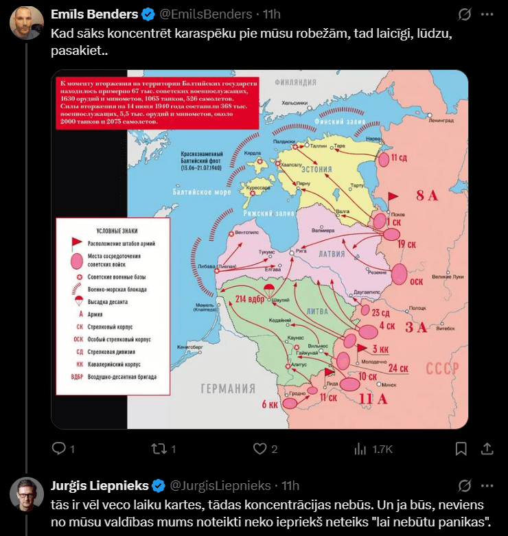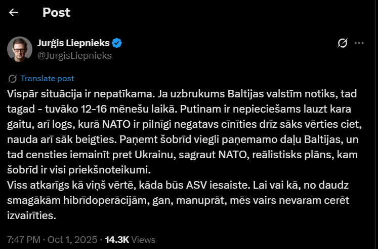“Vispār situācija ir nepatīkama. Ja uzbrukums Baltijas valstīm notiks, tad tagad – tuvāko 12-16 mēnešu laikā. Putinam ir nepieciešams lauzt kara gaitu, arī logs, kurā NATO ir pilnīgi negatavs cīnīties drīz sāks vērties ciet, nauda arī sāk beigties.