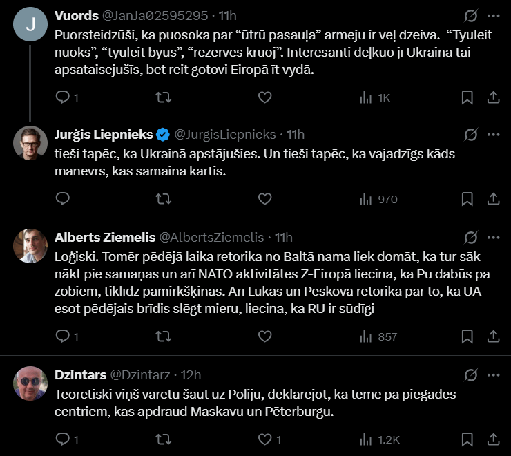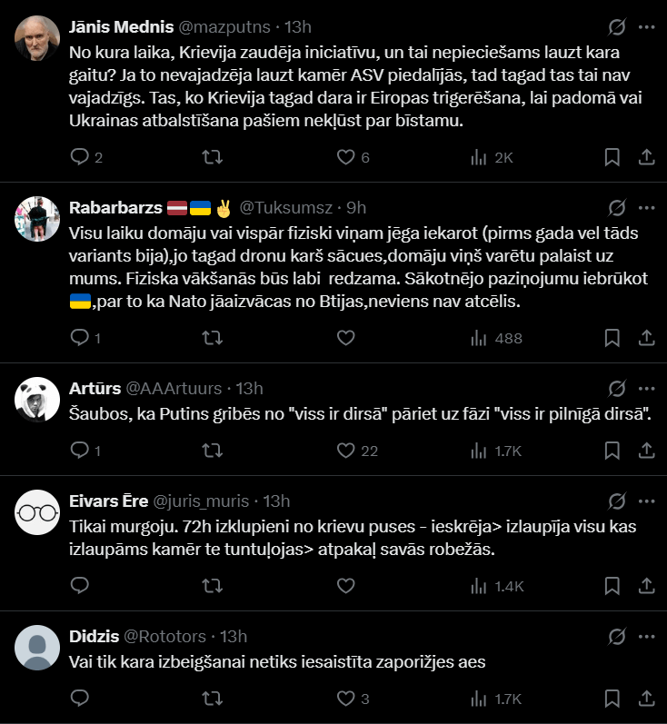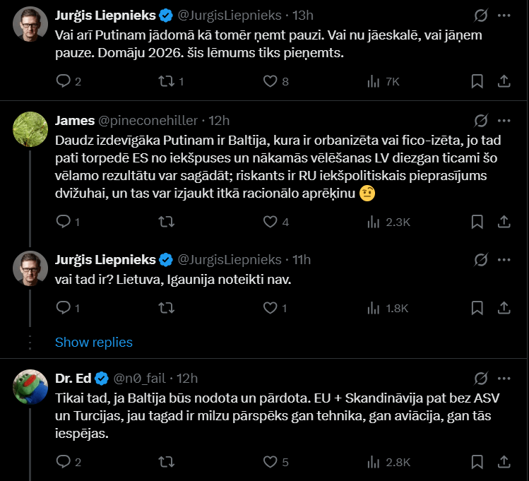 Viss atkarīgs kā viņš vērtē, kāda būs ASV iesaiste. Lai vai kā, no daudz smagākām hibrīdoperācijām, gan, manuprāt, mēs vairs nevaram cerēt izvairīties. Vai arī Putinam jādomā kā tomēr ņemt pauzi. Vai nu jāeskalē, vai jāņem pauze. Domāju 2026. šis lēmums tiks pieņemts,” viņš raksta.