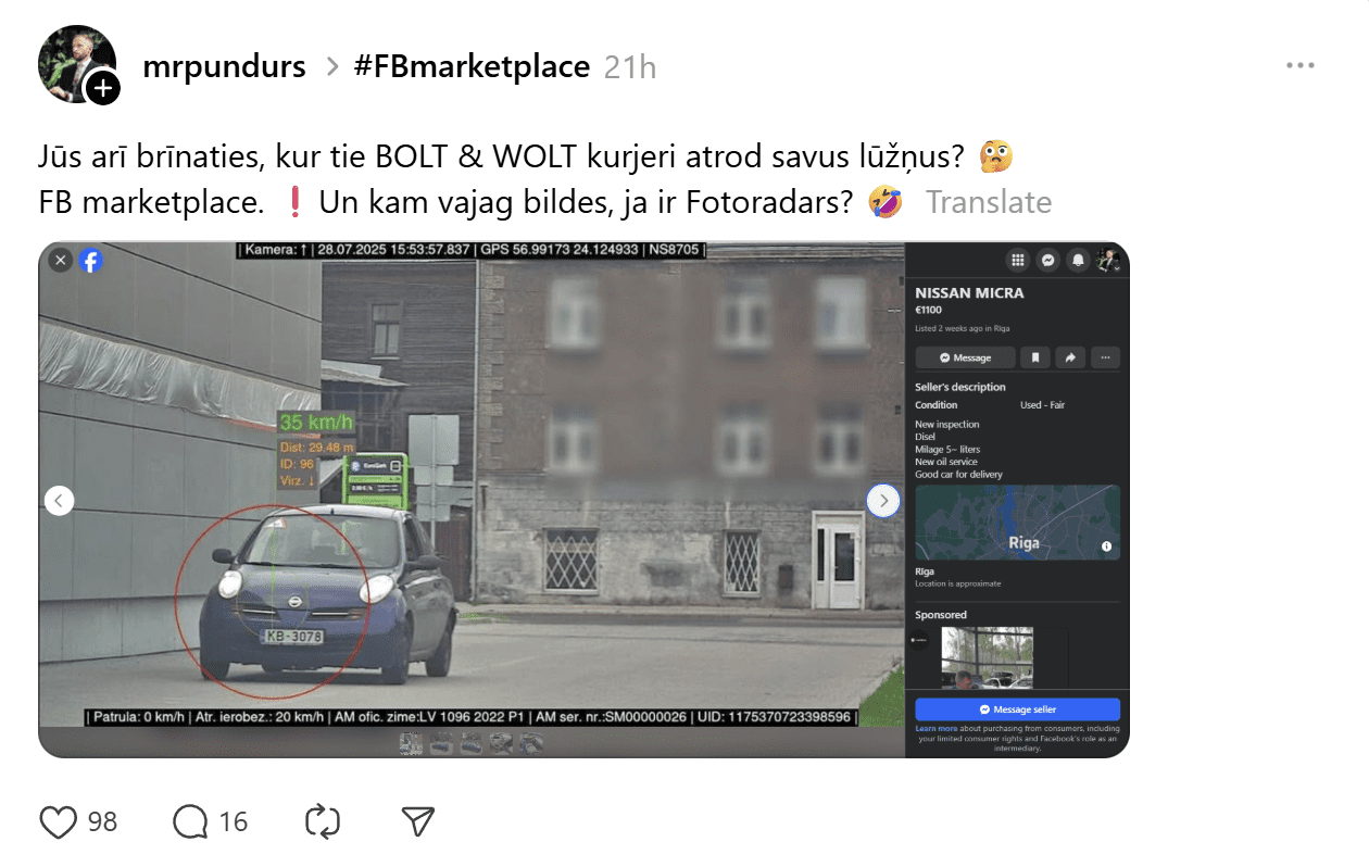 Piemērs, kas uzjautrinājis vairākus sociālā tīkla lietotājus, ir sludinājums, kurā par 1100 eiro tiek pārdota Nissan Micra markas automašīna ar norādi “Good car for delivery” [Laba automašīna piegāžu veikšanai]. Taču, kas šķiet vēl uzjautrinošāk, pie fotoattēliem pievienota fotoradara uzņemta fotogrāfija. ‘