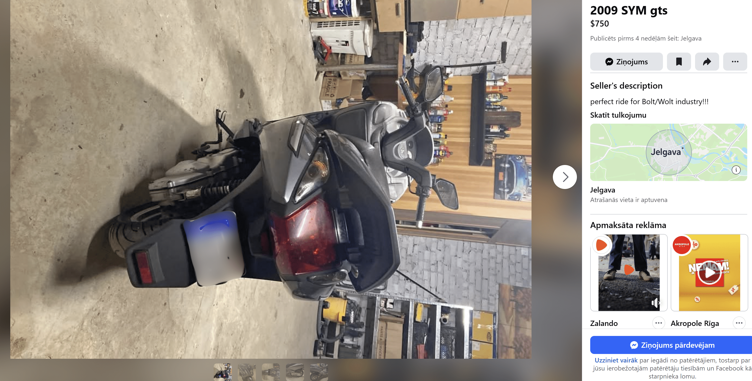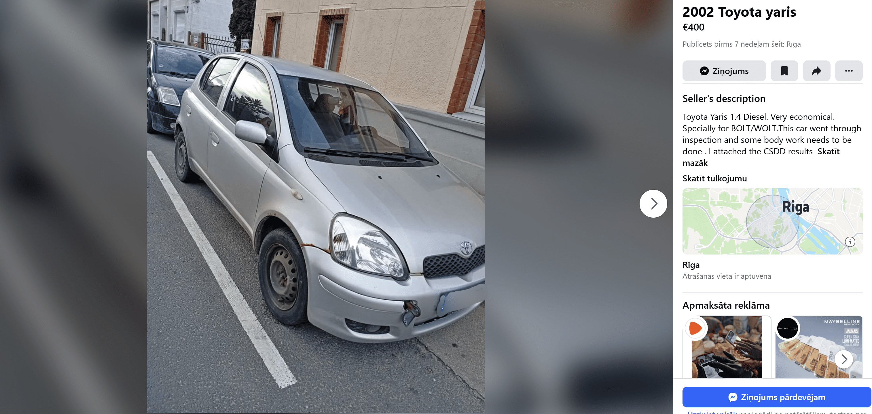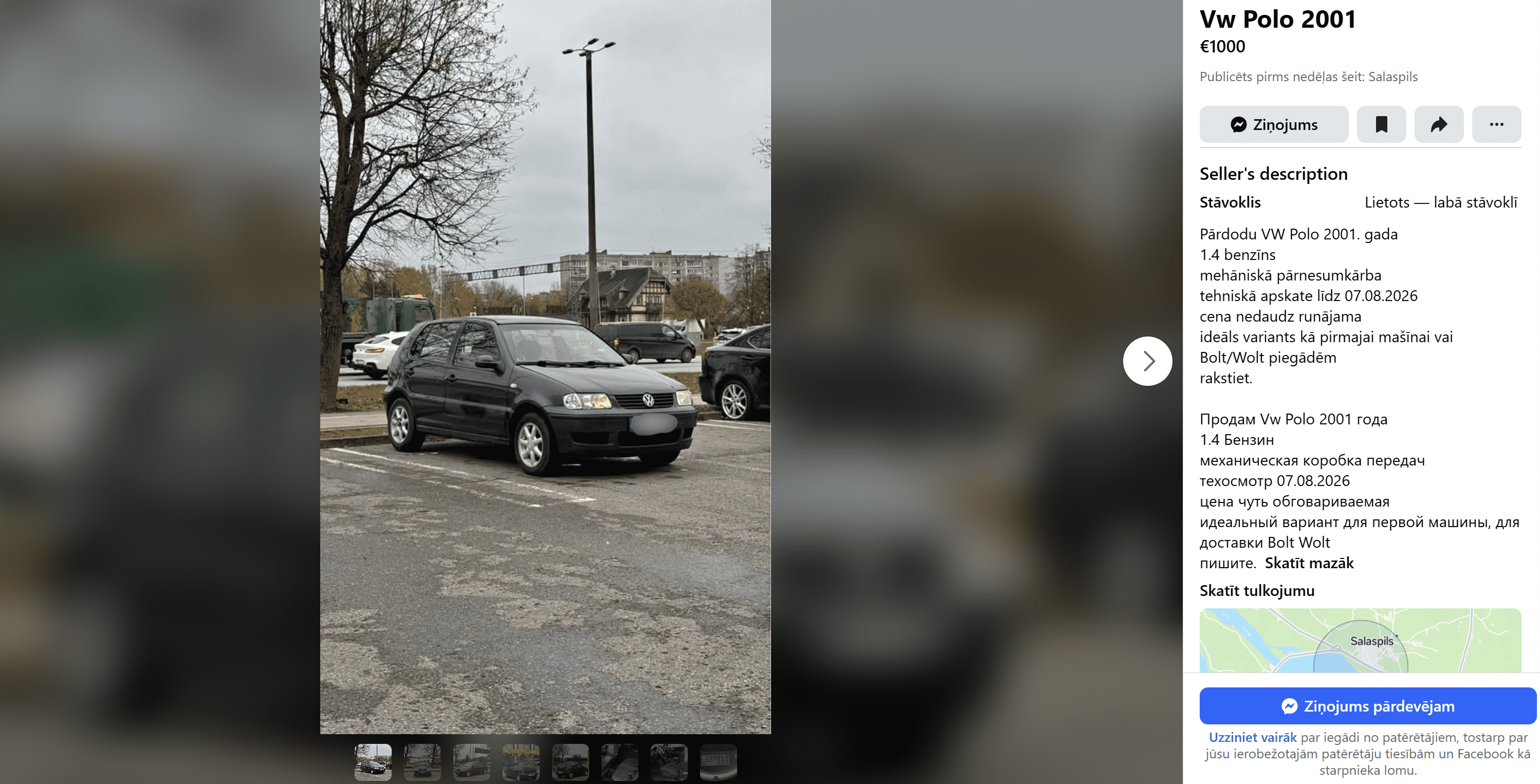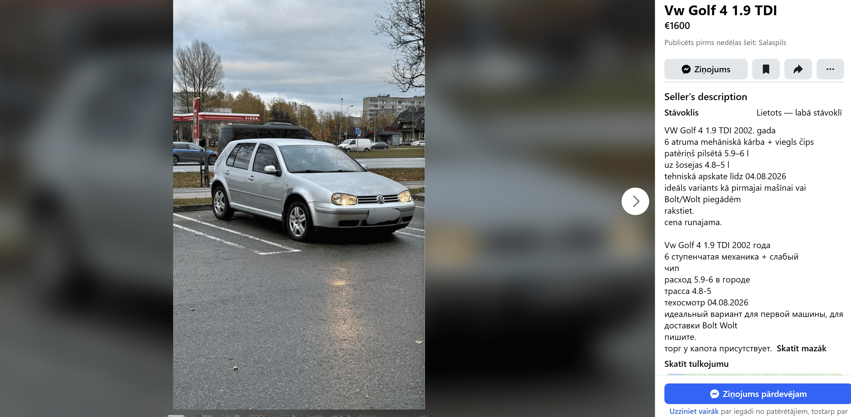Apskatot Facebook Marketplace piedāvājumu, novērojām vēl kādu automašīnu, kas tiek pārdota un kurai arī aprakstā tās pārdevējs ir norādījis, ka automašīna īpaši piemērota tiem cilvēkiem, kas ikdienā strādā kādā no ēdienu piegādes uzņēmumiem.