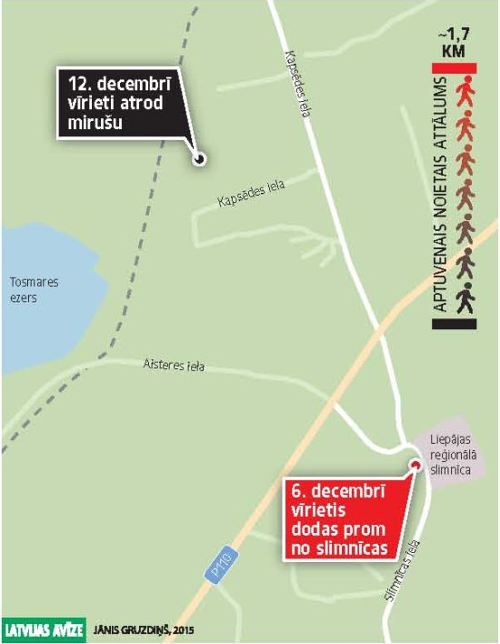 “Mobilizēju radus, draugus, paziņas, kopumā visu dienu laikā ap 30 cilvēku, jo bija sajūta, ka policija neko nedara, ka netic, ka tētis kaut kur noklīdis un mirst. Tā kā man ir zīdainītis, meklēšanas darbu koordināciju uzņēmās brālēns Kristaps Pinsters, kas ir skatuves meistars Liepājas teātrī. Kad prasījām kādu profesionāli policijai, to mums iedeva tikai tajā dienā, kad atrada tēta jaku un kinologs ar suni pa pēdām pie Tosmares ezera purvainos brikšņos tēti atrada. Mēs tur netālu bijām meklējuši, bet nevarējām iedomāties, ka tādā vietā – vairāk domājām, ka tētis gājis kājām uz mājām un tur kaut kur pazudis. Jo viņš daudz staigāja un ceļus zināja. Tāpēc gājām pa ceļiem, ceļmalām, veco dzelzceļu, mazdārziņu rajoniem.